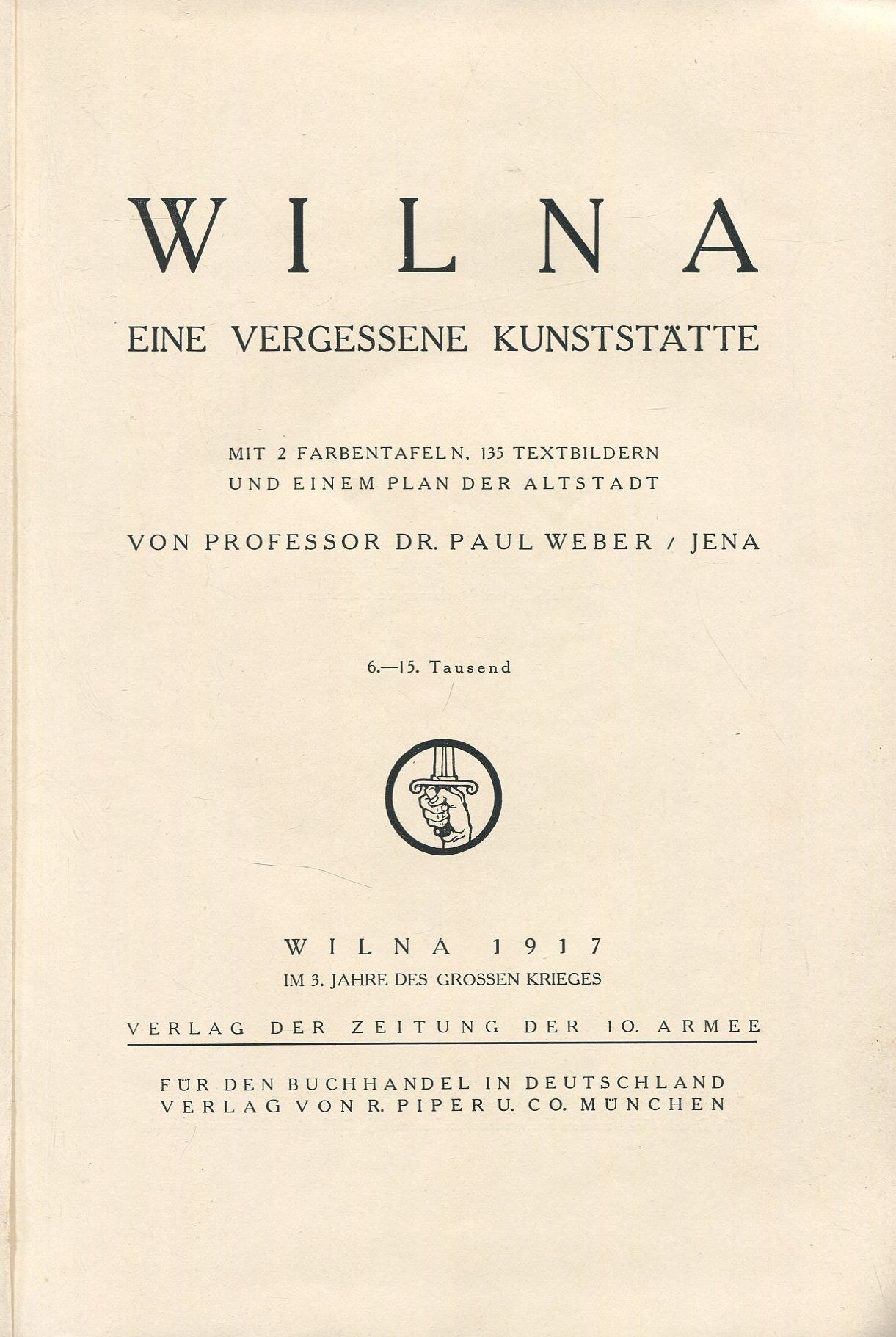 Wilno 1917. Zeitung der 10. Armee. 16x24 cm, str. 132, liczne czarno-białe ilustracje i fotografie w tekście, czarno-biały plan miasta na wklejce, dwie kolorowe reprodukcje na oddzielnych kartach, okładka miękka z obwolutą. Stan dobry (naddarcia i przybrudzenia obwoluty).