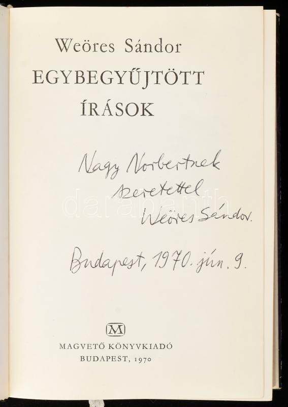 Weöres Sándor: Egybegyűjtött írások. I-II. köt. (DEDIKÁLT!) Bp., 1970, Magvető, 1 t. + 723+(1) p.; 831+(1) p. Kiadói egészvászon-kötés, kiadói papír védőborítóban. Az I. kötet címlapján a szerző, Weöres Sándor (1913-1989) Kossuth- és Baumgarten-díjas költő, író, műfordító dedikációjával.