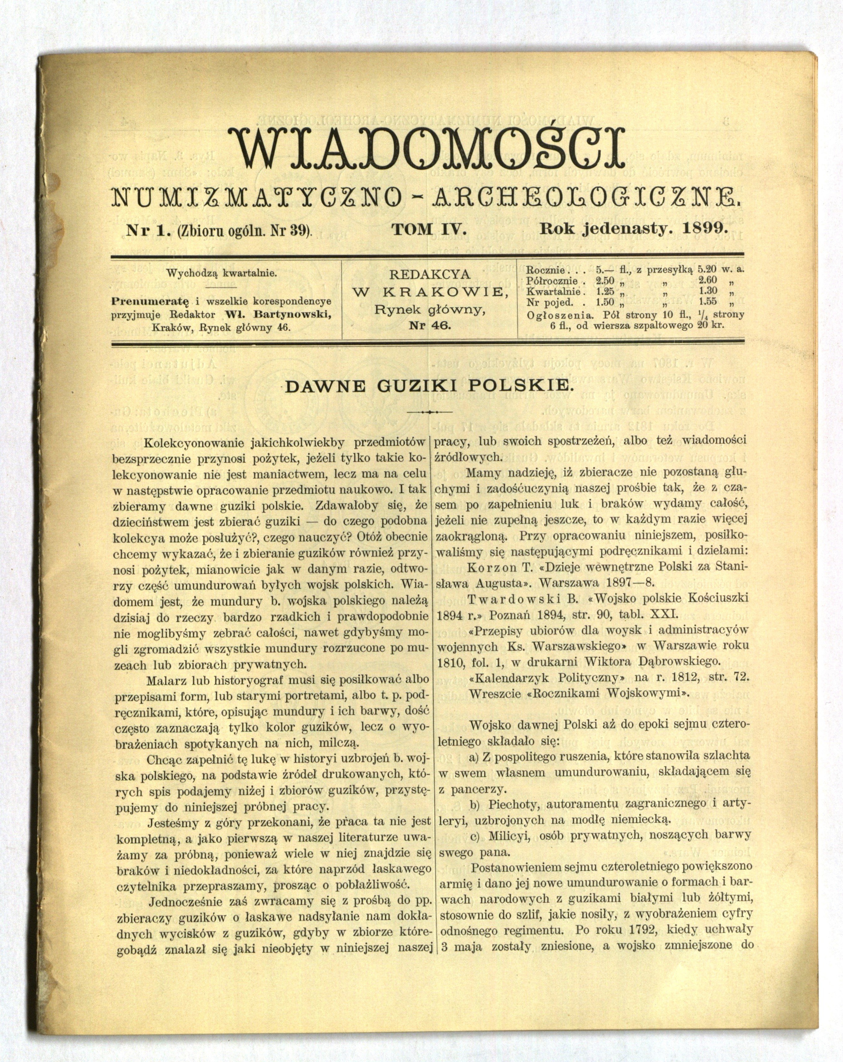 WIADOMOŚCI Numizmatyczno-Archeologiczne. Nr 1 (39): 1899, łam 1-40; w nr m. in.: J. Zieliński, Hanusz Trylner, mincmistrz mennicy wileńskiej, złotnik i pieczętarz J. K. M. Zygmunta III; W. Kostrzębski, Kolekcyonowanie zbiorów numizmatycznych i ich katalogowanie; blok luźny, st. bdb.; wym. ok. 223x280 mm.