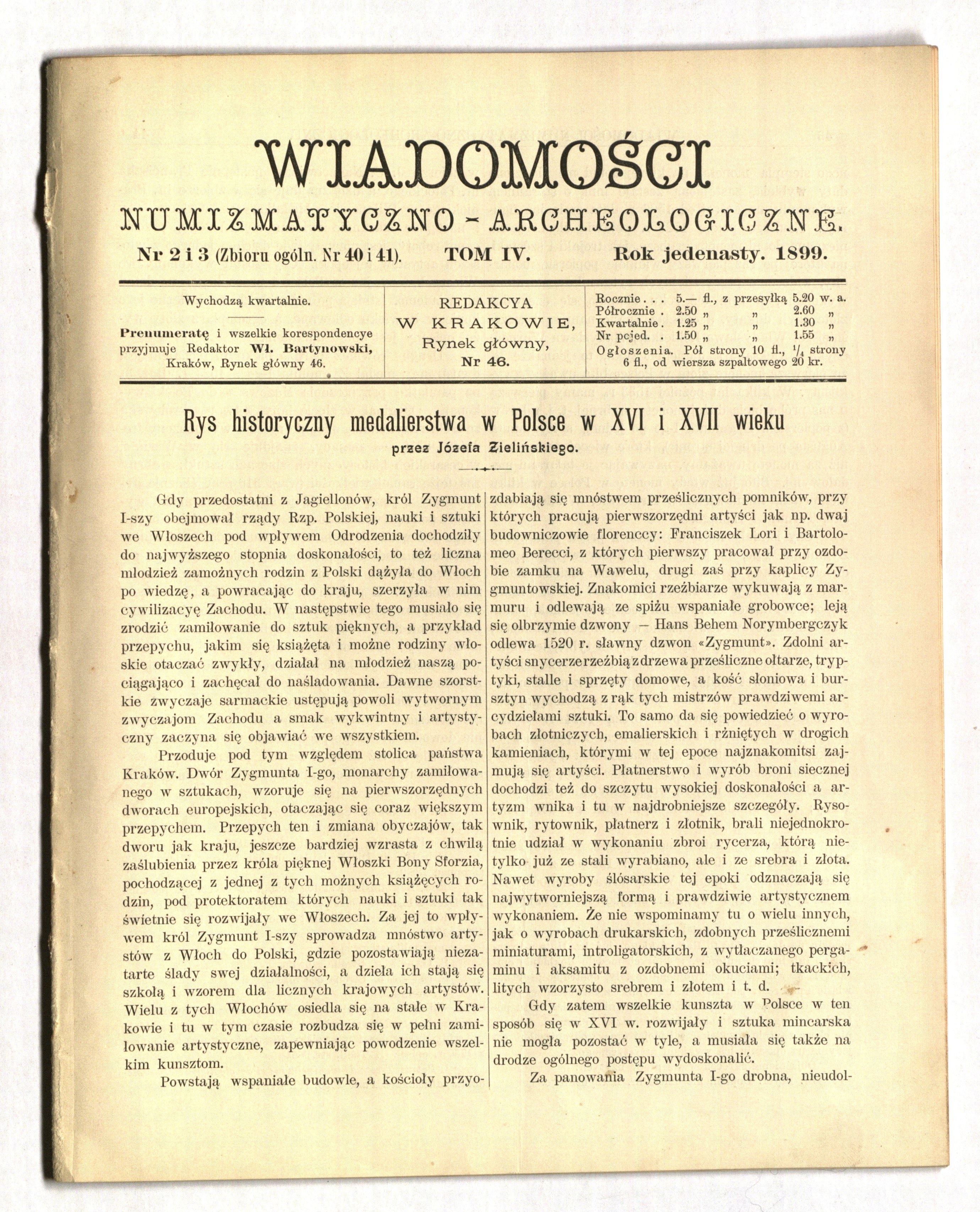 WIADOMOŚCI Numizmatyczno-Archeologiczne. Nr 2 i 3 (40 i 41), łam 41-104; w nr m. in.: Dwa nieopisane talary z roku 1658? i 1661; łam 43, 46, 49, 50, 53, 84, 85 z podkreśleniami długopisem, drobne rozdarcie; st. bdb.; wym. ok. 223x280 mm.