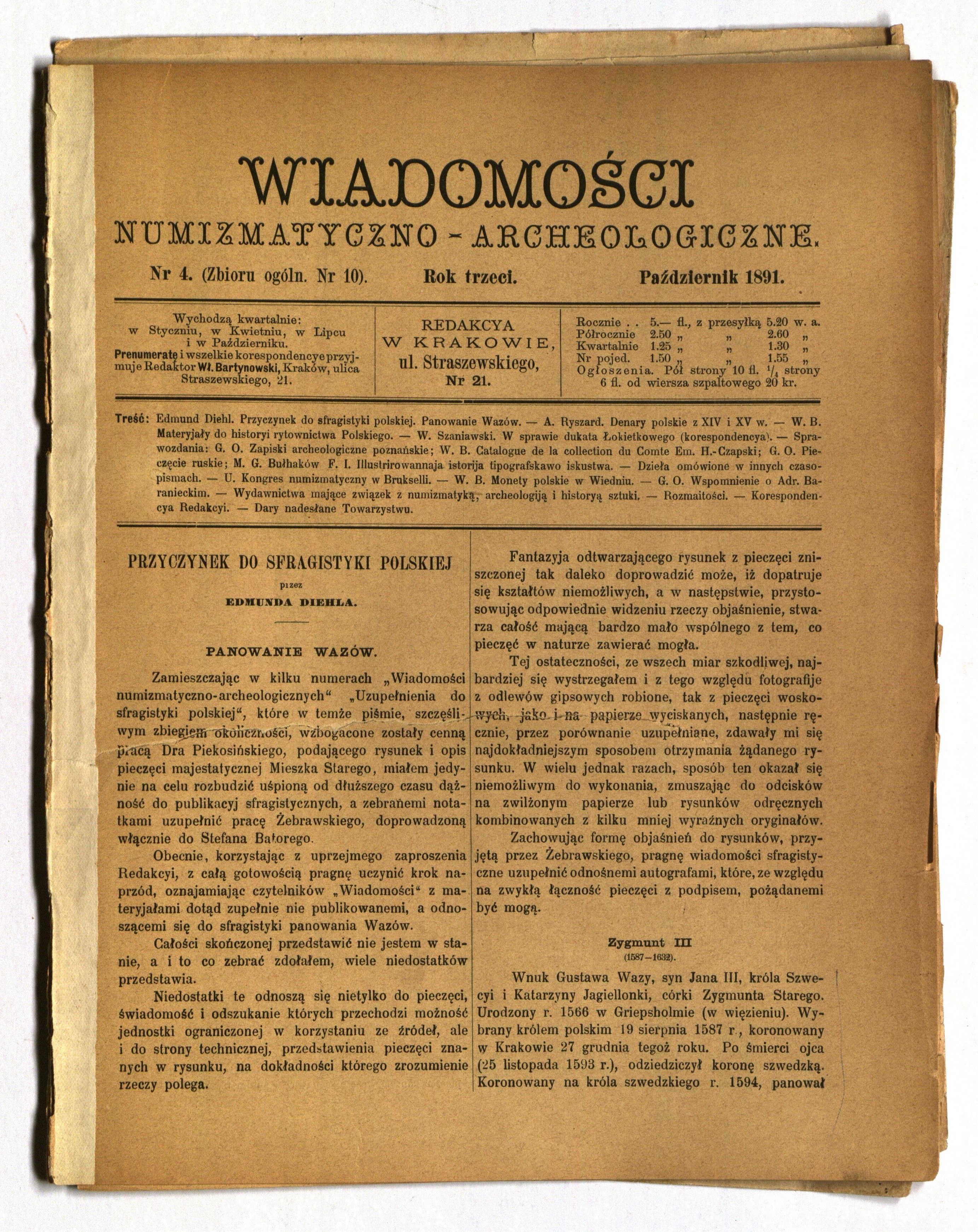 WIADOMOŚCI Numizmatyczno-Archeologiczne. Nr 4 (10): październik 1891, łam 237- 268, luzem jako dodatek tab. I, II, III, w nr m. in.: A. Ryszard, Denary polskie z XIV-go i XV-go wieków ze zbioru A. Ryszarda; Rysunki monet najrzadszych zamieszczonych w IV tomie Katalogu monet i medali polskich E. hr. Czapskiego; Najrzadsze monety polskie w zbiorach cesarskich w Wiedniu (Fig 3, 4, tabl. III); grzbiet podklejony, rozdarcia na górze i na dole, niektóre kartki luzem, rozdarcie str. tyt. i tab. I, st. db.; wym. ok. 223x280 mm.