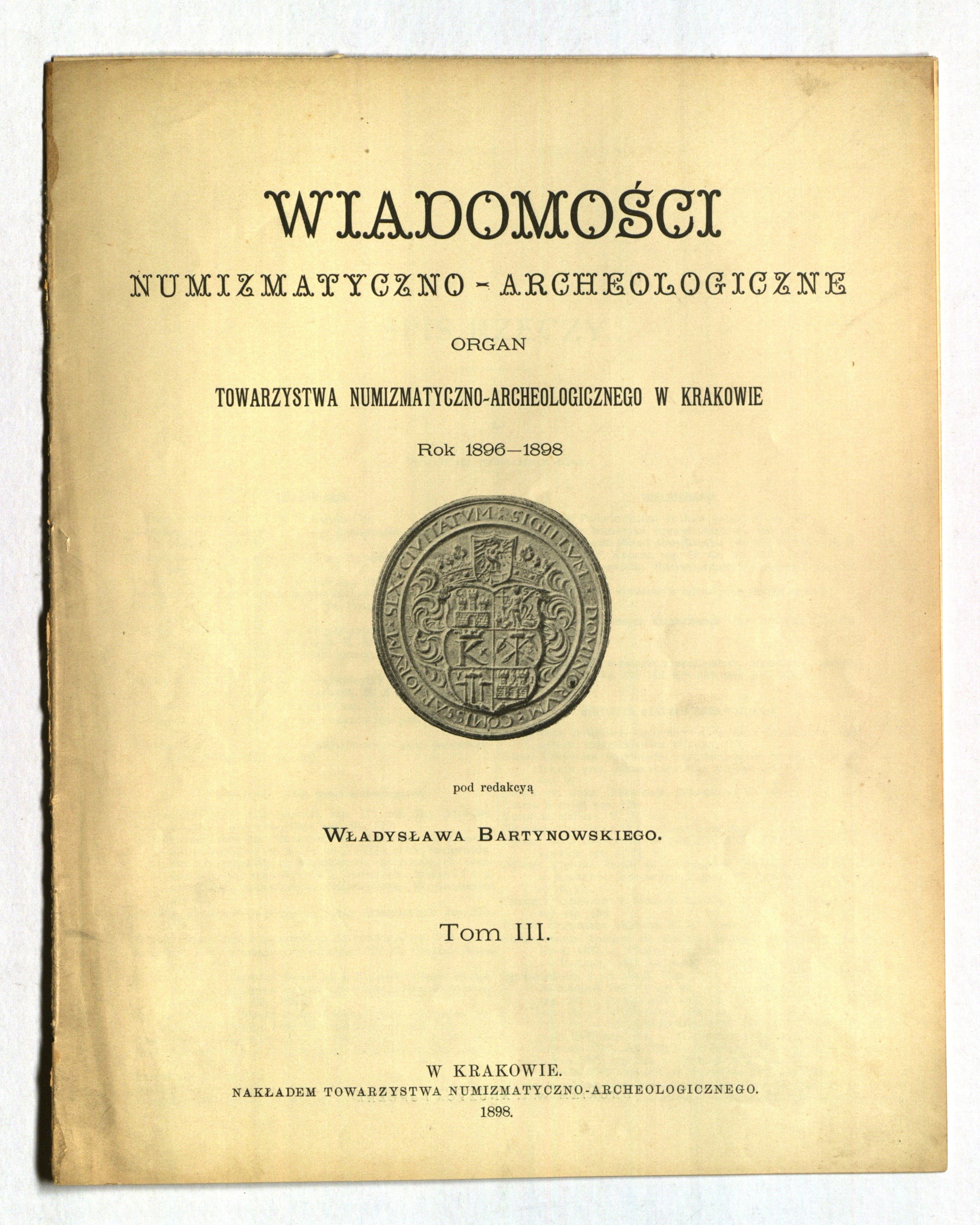 WIADOMOŚCI Numizmatyczno-Archeologiczne. Rok 1896-1898, Spis Rzeczy T. III, łam XIV; blok luźny, drobne zabrudzenia, st. db., wym. ok. 223x280 mm.