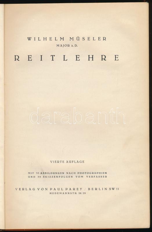 Wilhelm Müseler: Reitlehre. Berlin,én.,Paul Parey. Vierte Auflage. Fekete-fehér illusztrációkkal. Kiadói egészvászon-kötés, ceruzás aláhúzásokkal és bejelölésekkel. Sigray Margit névbejegyzésével (Margit Sigray 1935.) Sigray Margit (1910-1984) grófnő, lótenyésztő, a magyar fogathajtás technikájának meghonosítója az USA-ban.