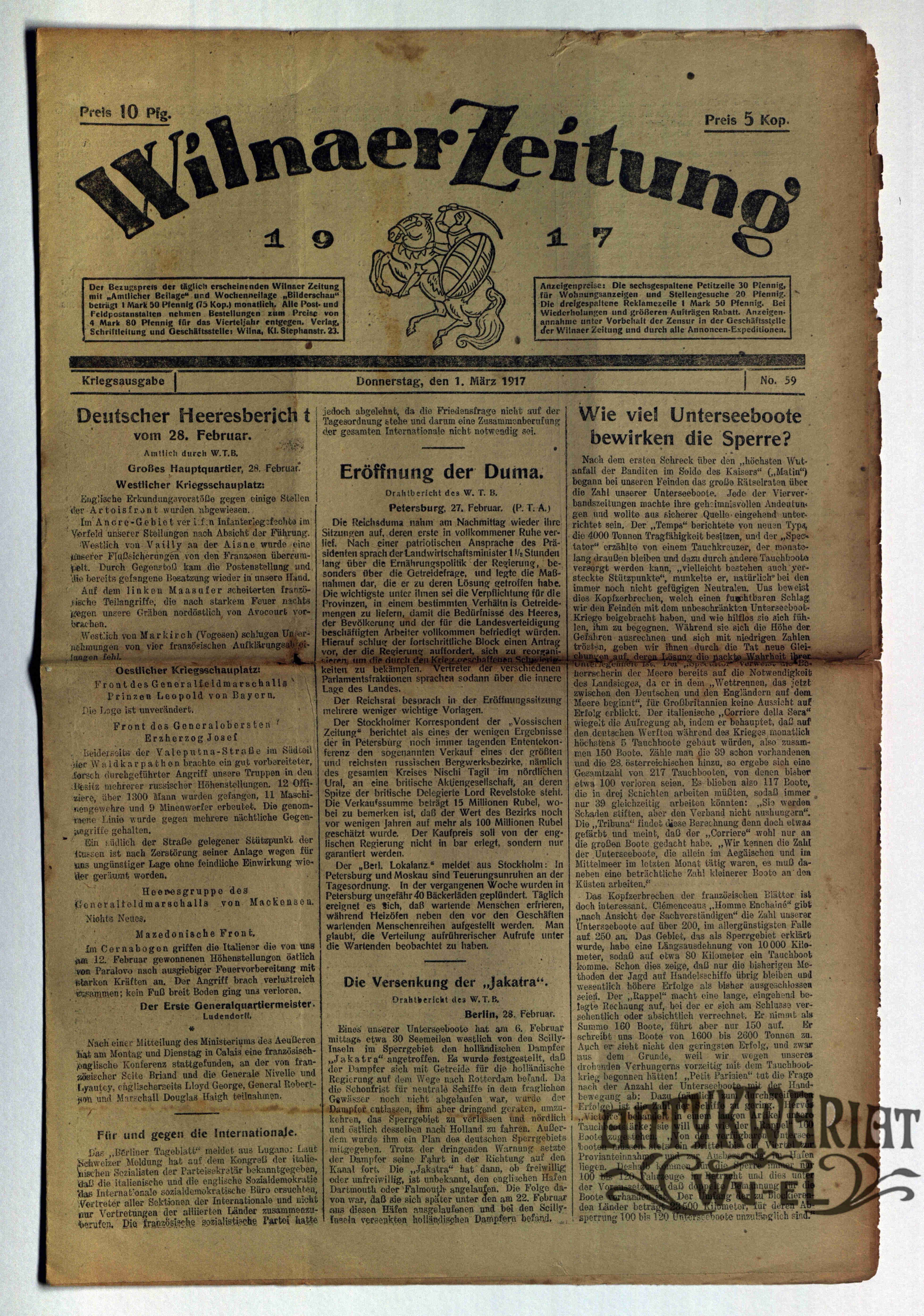 WILNO. "Wilnaer Zeitung", nr 59, 1 marca 1917, druk i wyd. Wilnaer Zeitung. Dwustronicowy dodatek, który zawiera ciąg dalszy listy wziętych do niewoli przez Niemców (?) z Wilna i okolicy.