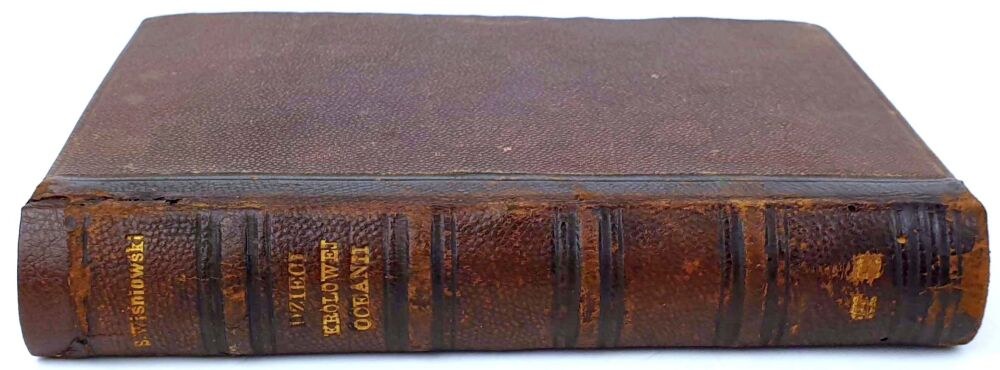 TWARDA OPRAWA PÓŁSKÓREK Z EPOKI, GRZBIET Z WYPUKŁYMI ZWIĘZAMI, TŁOCZENIAMI I ZŁOCENIAMI