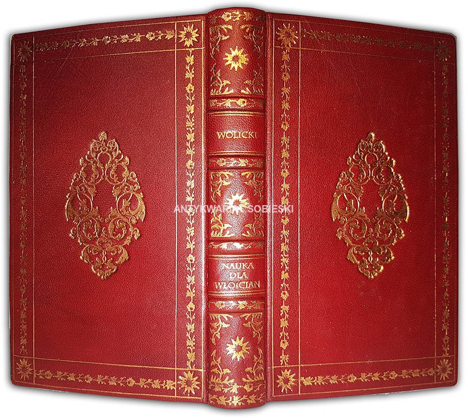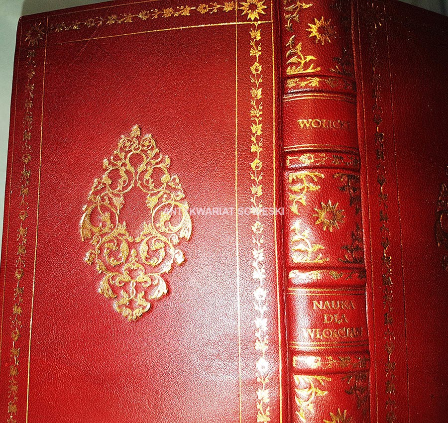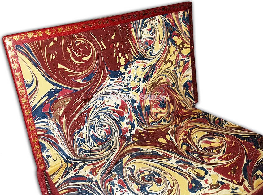 TWARDA OPRAWA PEŁNA SKÓRA WSPÓŁCZESNA OZDOBNA, NA LICACH OZDOBNA BODIURA O CHARAKTERZE ROŚLINNYM ZWIEŃCZONA W NAROŻNIKACH ZŁOCONYM KWIECIEMI, W ZWIERCIADLE OKŁADEK MISTERNIE TŁOCZONY I ZŁOCONY OZDOBNIK O CHARAKTERZE ROŚLINNYM, GRZBIET Z PODZIAŁEM NA POLA, WYPUKŁYMI ZWIĘZAMI I BOGATYMI ZŁOCENIAMI, OOBCIĘCIA KART BARWIONE, WYKLEJKI Z RĘCZNIE BARWIONEGO PAPIERU MARMORYZOWANEGO. WNĘTRZA OKŁADEK WYKOŃCZONE ZŁOTYM SZLACZKIEM. OPRAWA NAWIĄZUJĄCA STYLISTYKĄ DO ZBYTKOWNYCH OPRAW Z EPOKI!