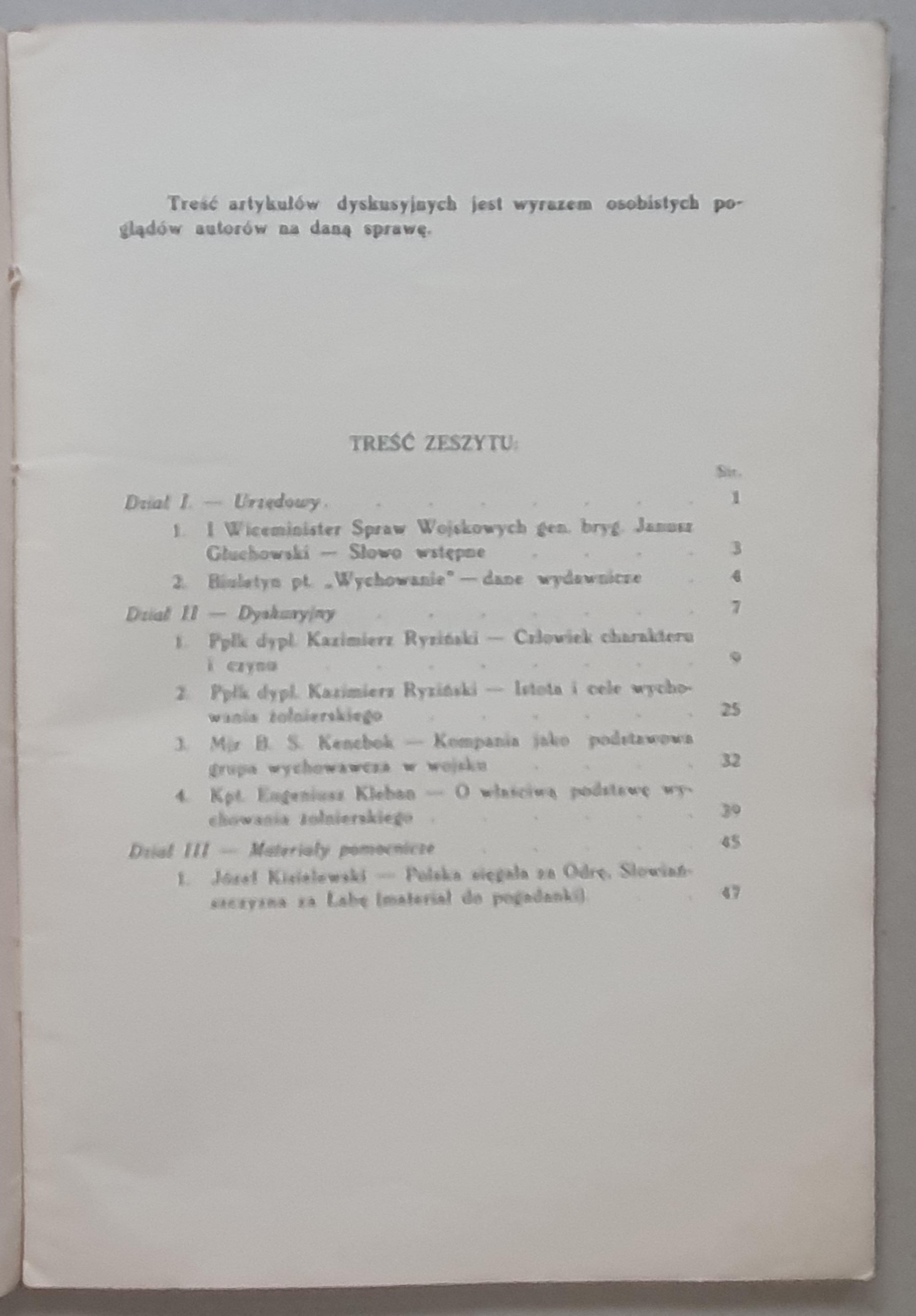 W treści, m.in.: o celach tego wydawnictwa, o istocie i celach wychowania żołnierskiego, materiały do pogadanki na temat historycznej zachodniej granicy Polski, obejmującej Odrę i tereny słowiańskie za Łabą - na podstawie artykuły Józefa Kisielewskiego (autora reportażu z Niemiec „Ziemia gromadzi prochy”, z 1939 roku, który opisywał m.in. sytuację Słowiańszczyzny w Rzeszy i jej historycznych związkach z Polską)