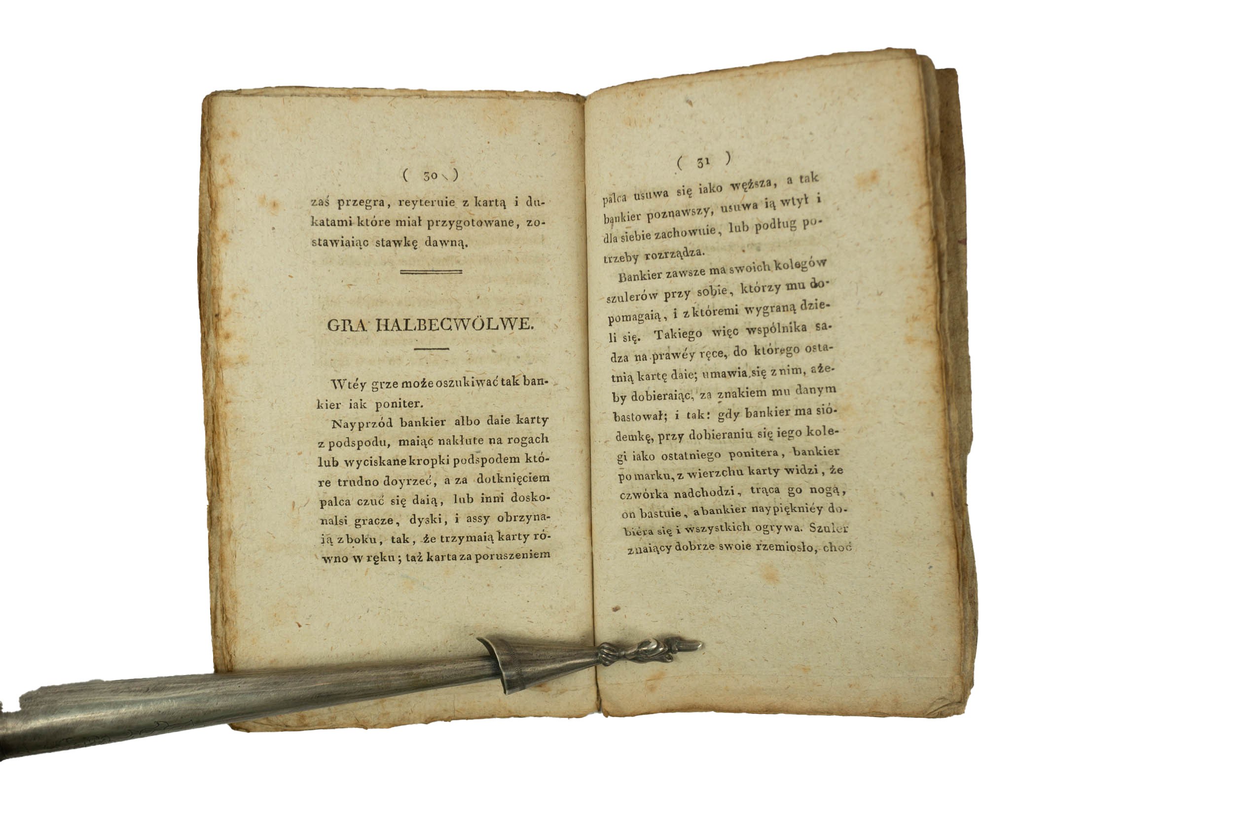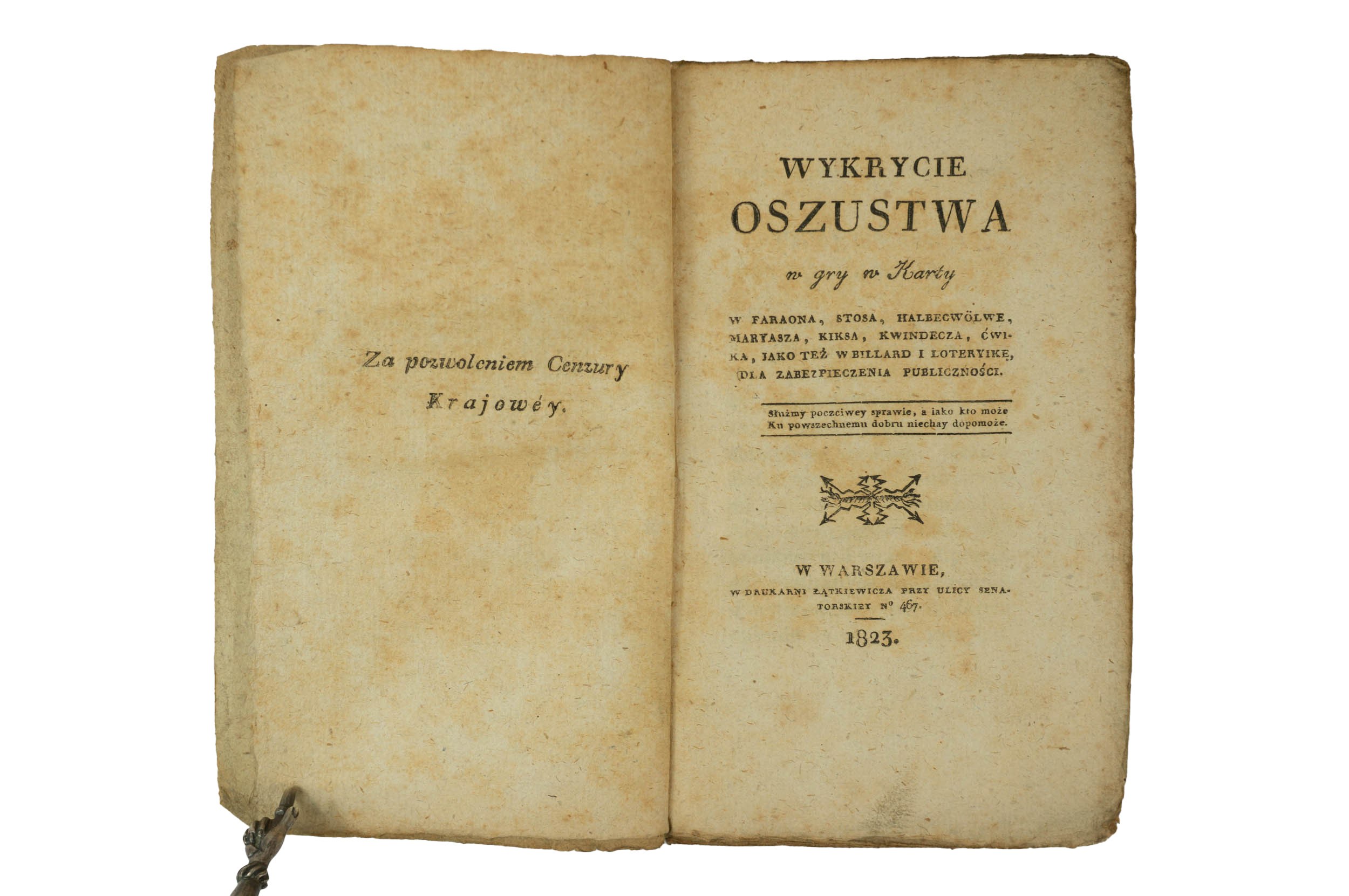 Wykrycie oszustwa w różne gry w karty, w faraona, stosa, halbecwolwe, maryasza, kiksa, kwndecza, ćwika jako też w billard i loteryikę dla zabezpieczenia publiczności, w Warszawie 1823r. w drukarni Łątkiewicza przy ulicy Senatorskiej nr 467, f. 11,5 x 18,5cm, s. [1], XX, 59, BARDZO RZADKIE