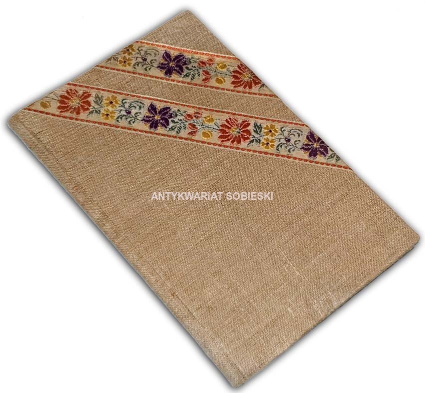 TWARDA OPRAWA PŁÓCIENNA Z EPOKI, PŁÓTNO SZARE Z APLIKACJAMI: TAŚMA Z KWIATOWYMI MOTYWAMI LUDOWYMI