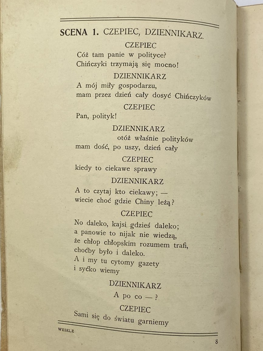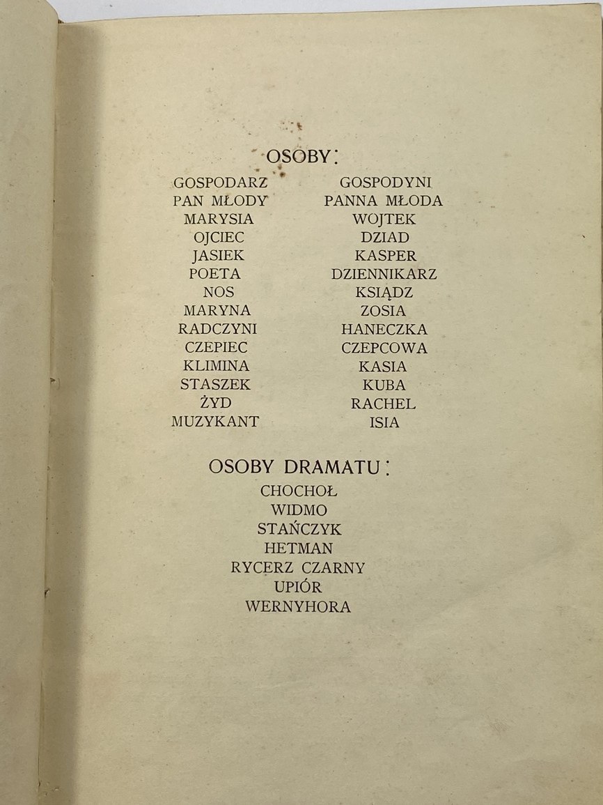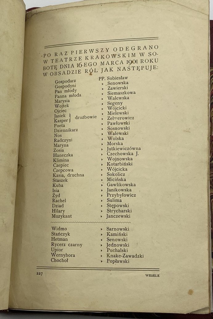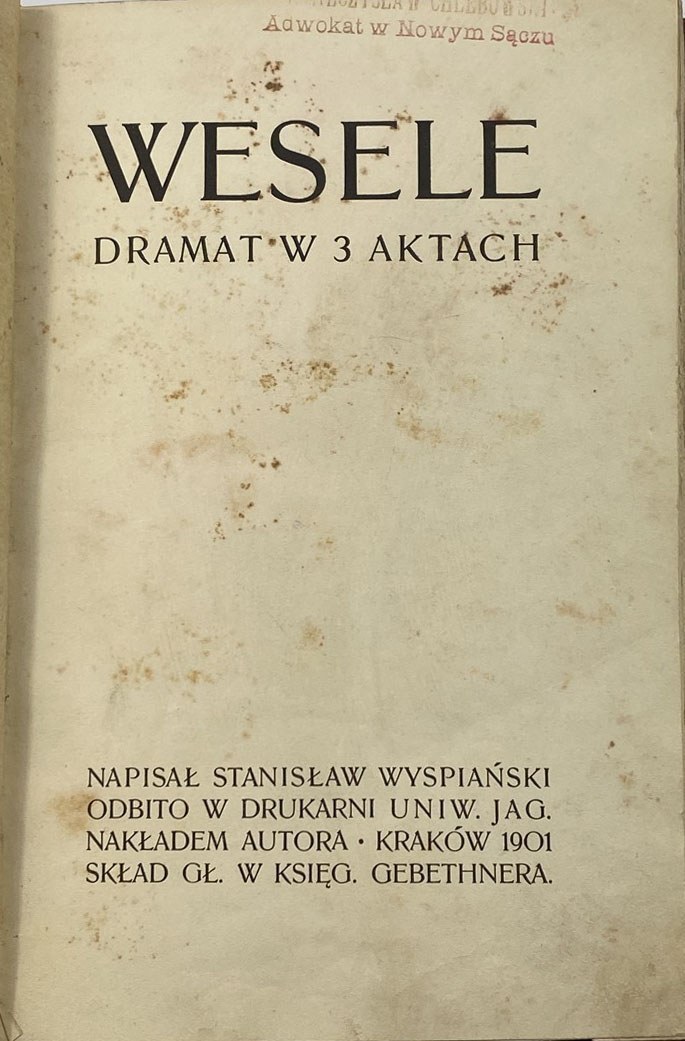 Wyspiański Stanisław, Wesele. Dramat w trzech aktach, wydano nakładem autora, odbito w Drukarni Uniwersytetu Jagiellońskiego, wydanie drugie, Kraków 1901, s. 229, wymiary 14,5 x 21,5 cm. Półskórek współczesny wykonany ręcznie w pracowni Suszek Books, grzbiet z wypukłymi zwięzami i złoceniami, skórzany szyldzik, przybrudzenia na stronie tytułowej, pieczątka "Adwokat Mieczysław Chlebowski Nowy Sącz".