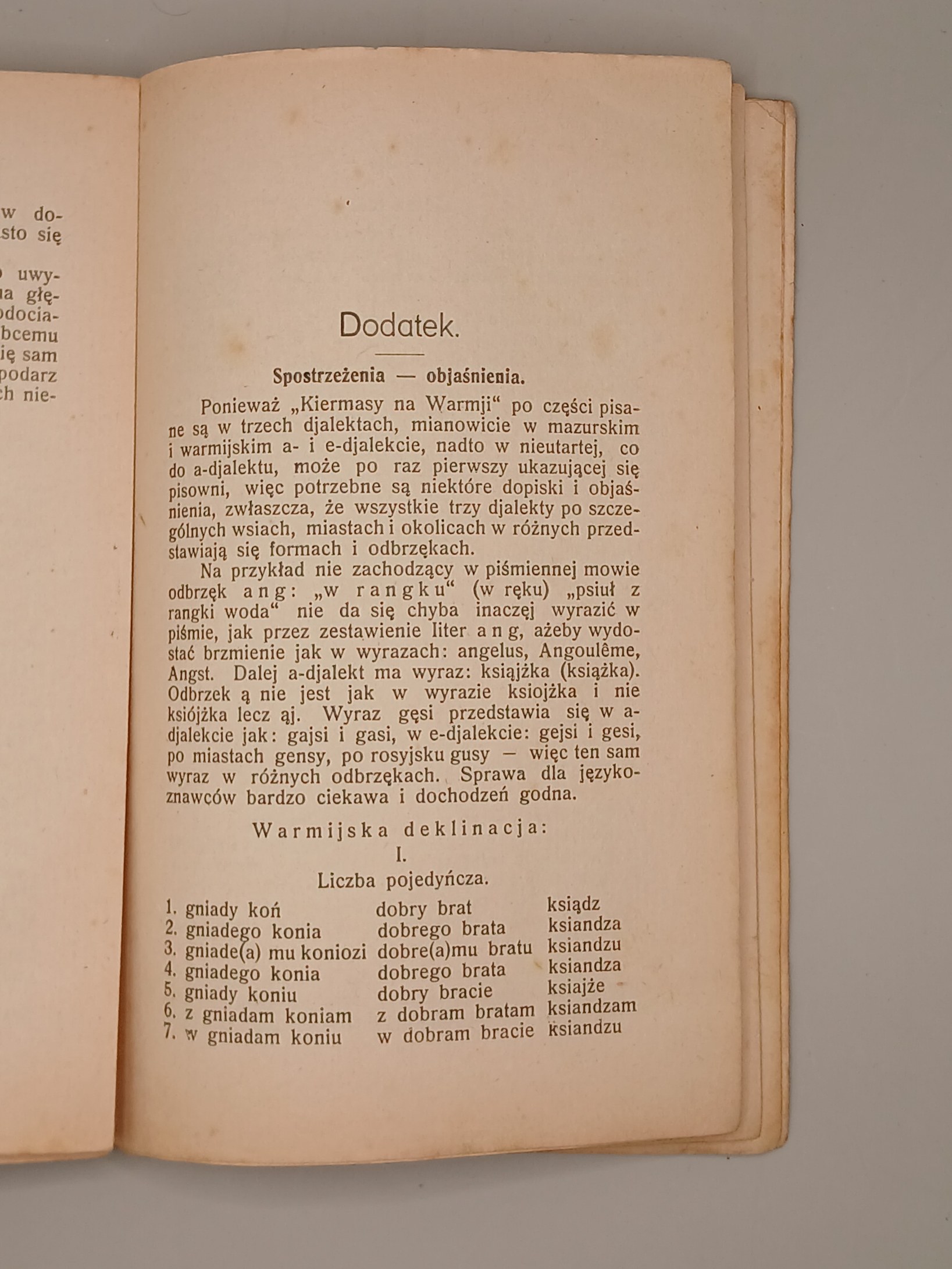 Historyczno-etnograficzna monografia Warmii, zawiera m.in.: Historia Warmji; Djalekt warmijski; Ludność warmijska; Kiermas warmijski; Religijność i walka kulturalna na Warmii; Uprawa lnu, separacja, ablucja na Warmii; Przysłowia na polskiej Warmii. Duży fragment o objawieniach w Gietrzwałdzie.