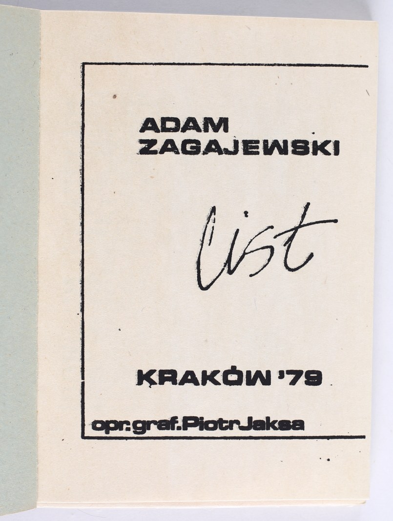 ZAGAJEWSKI Adam - List. Kraków 1979. Opr. graf. Piotr Jaksa. Krakowska Oficyna Studentów.
