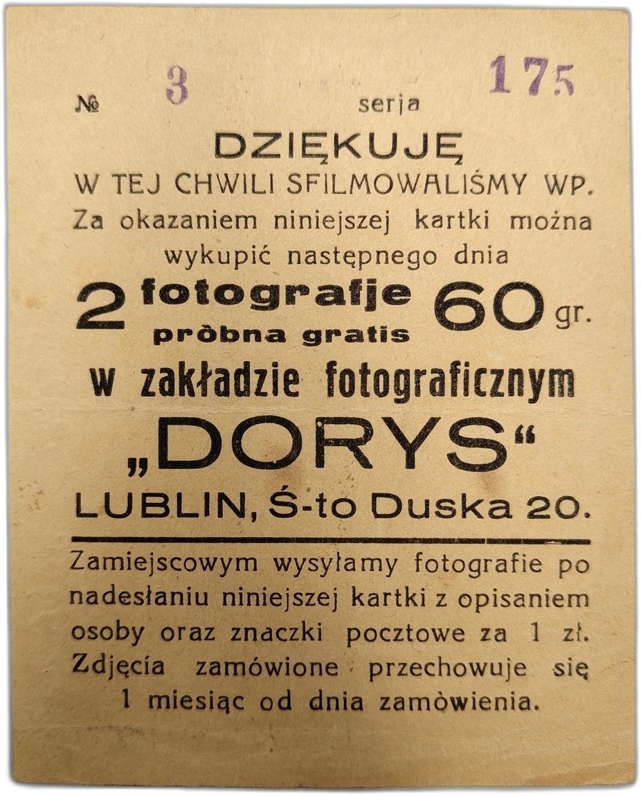 Zakład fotograficzny DORYS - Lublin - karta wykupu fotografii, ca 1920