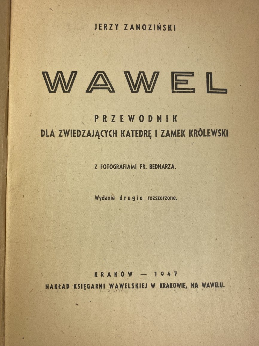 Zanoziński Jerzy, Wawel: przewodnik dla zwiedzających katedrę i zamek królewski, nakł. Księgarni Wawelskiej, Kraków 1947, s. 36, wymiary 12 x 17 cm. Okładka broszurowa, wydawnicza. Zabrudzenia, otarcia okładki.