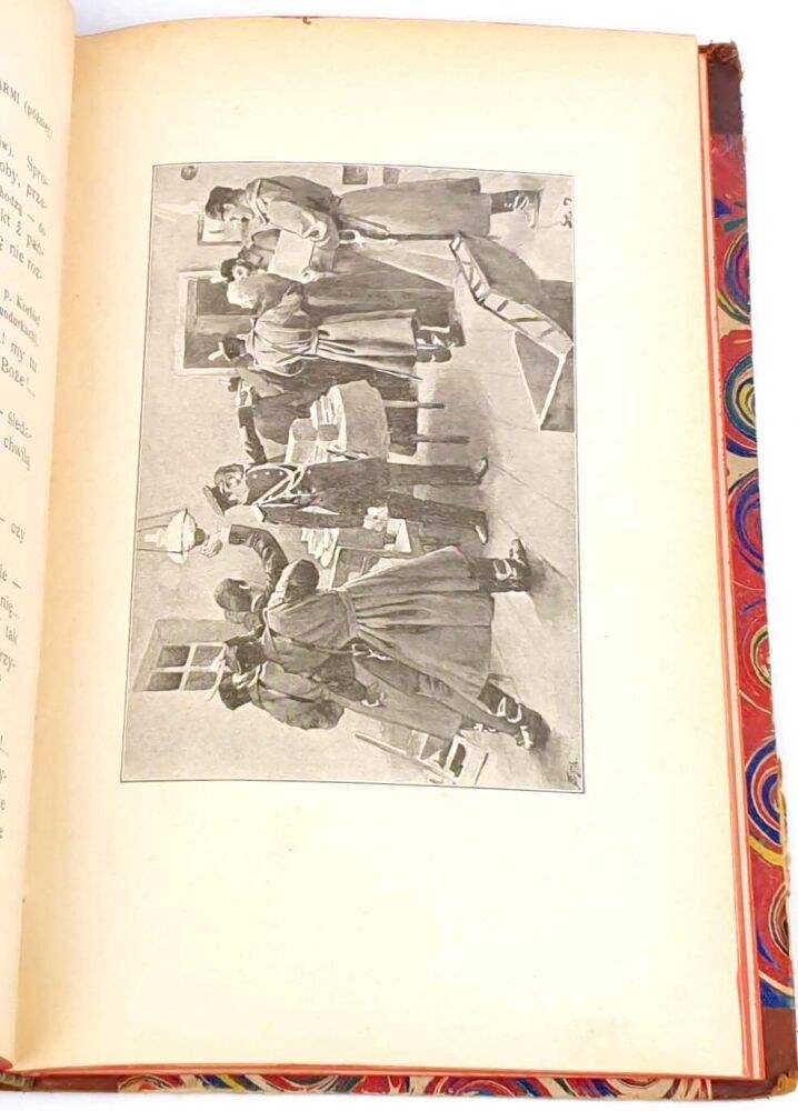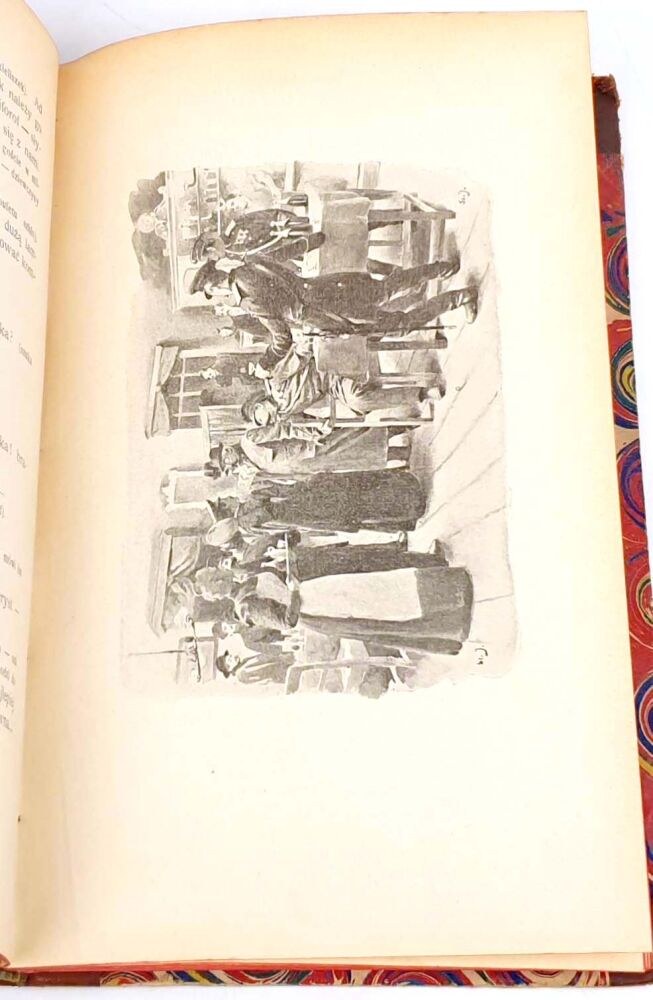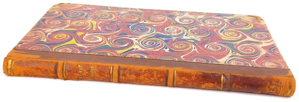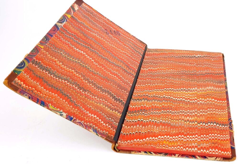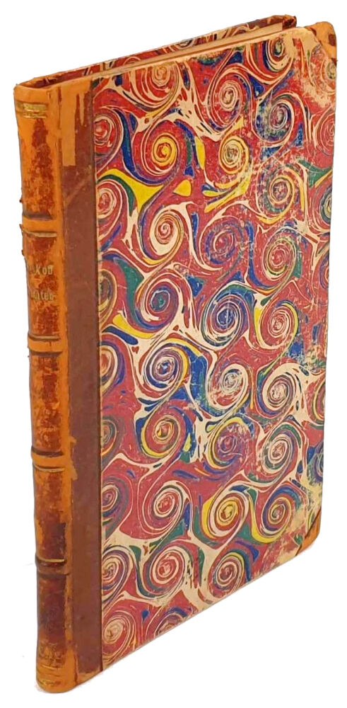 TWARDA OPRAWA PÓŁSKÓREK Z EPOKI. GRZBIET Z WYPUKŁYMI ZWIĘZAMI, TŁOCZENIAMI I ZŁOCENIAMI. KARTON MARMORYZOWANY. WYKLEJKI Z PAPIERU MARMORYZOWANEGO.