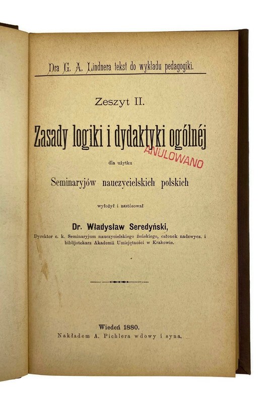 Zasady logiki i dydaktyki ogólnej. Zeszyt II - Dr G. A. Linder, Dr Władysław Seredyński, książka wydana w 1880 roku w Wiedniu nakładem A. Pichlera wdowy i syna
