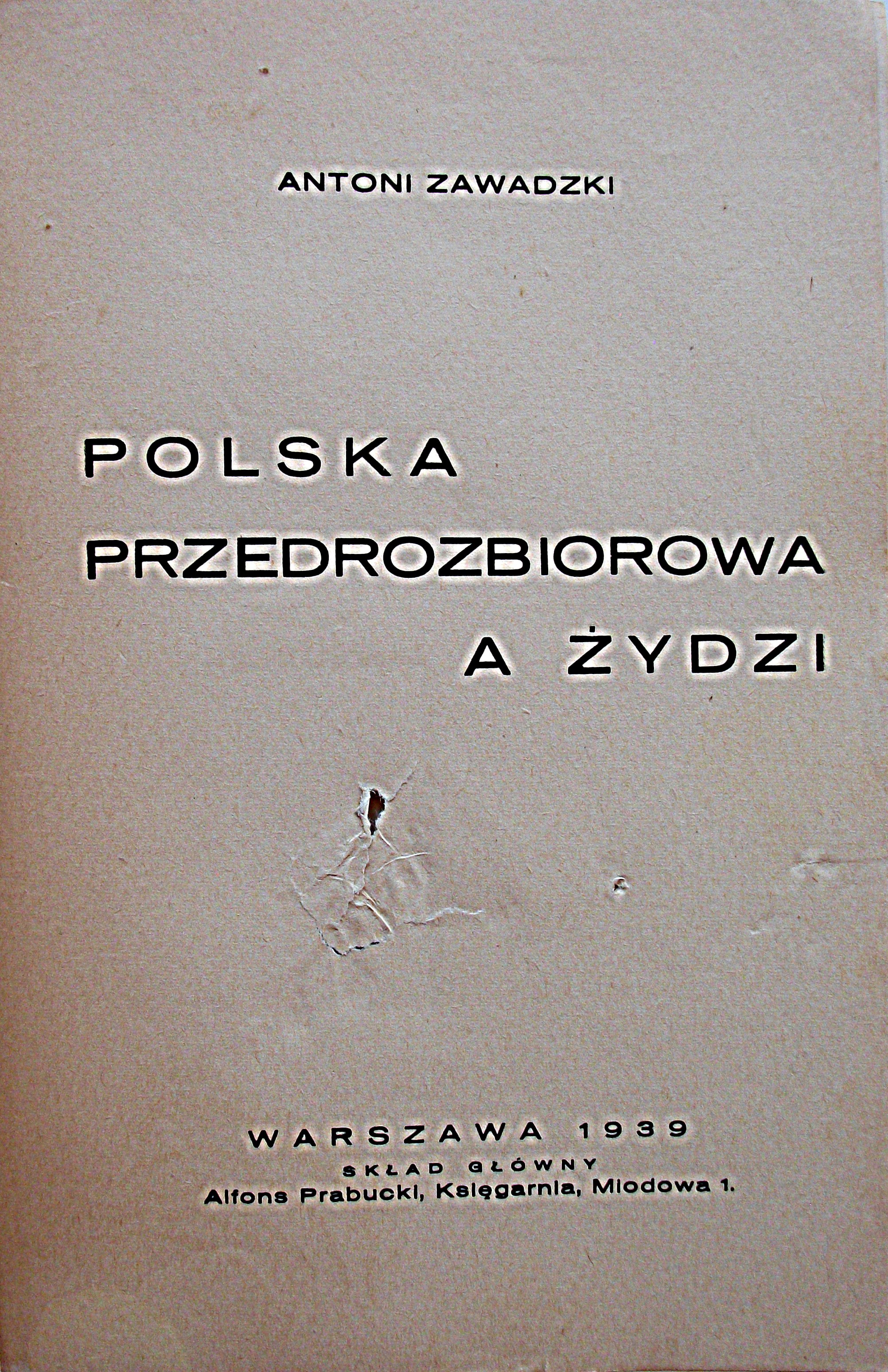 ZAWADZKI ANTONI. Polska przedrozbiorowa a żydzi. W-wa 1939. Skład główny Alfons Prabucki, Księgarnia...