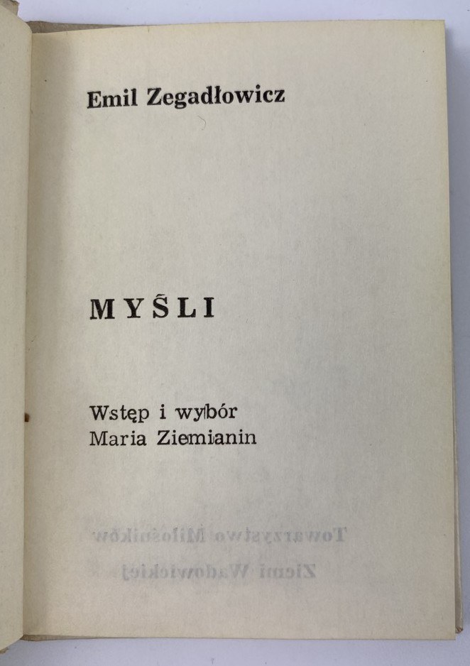 Zegadłowicz Emil, Myśli, Biblioteka "Nadskawia" miniatury, Zakopane: Oficyna Wydawnicza Związku Podhalan; [Wadowice]: Towarzystwo Miłośników Ziemi Wadowickiej, 1987, I wydanie, s. 59, [5], wymiary 7 x 9,5 cm. Wstęp i wybór Maria Ziemianin. Okładka twarda, wydawnicza. Niewielkie zabrudzenia okładki.
