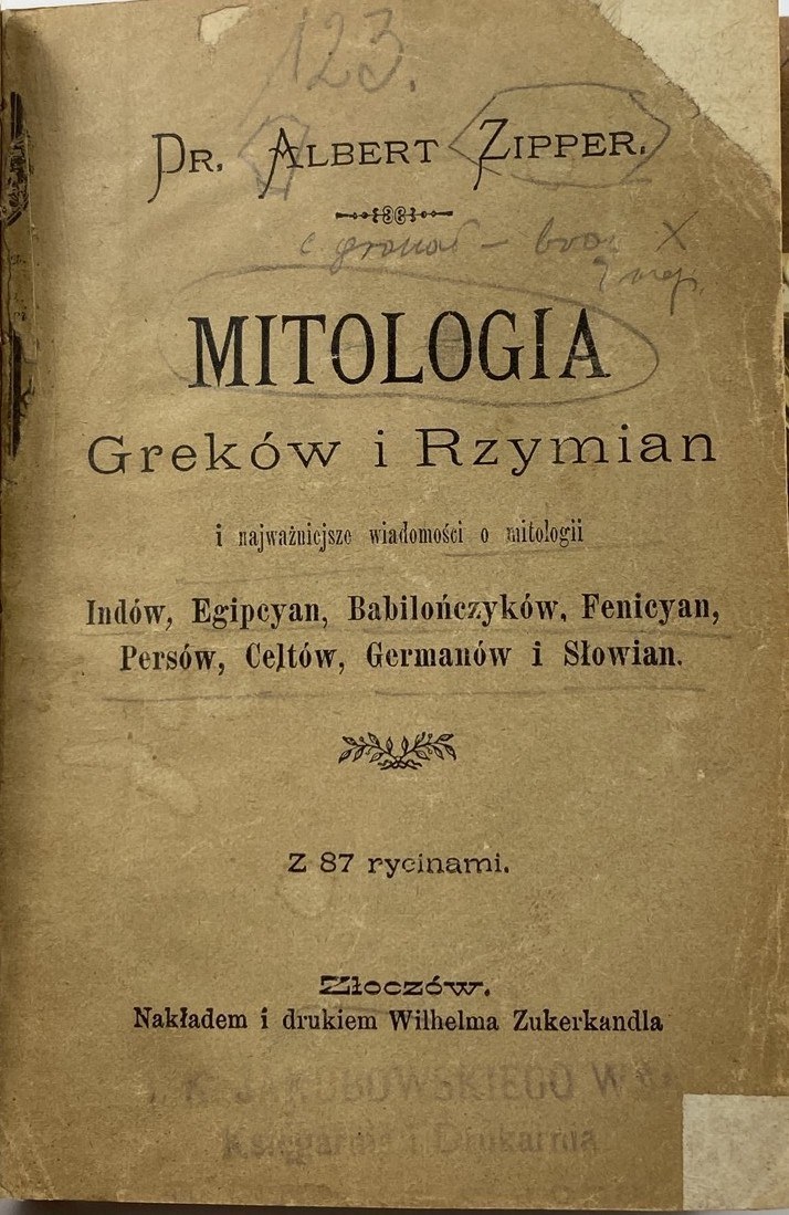Zipper Albert, Mitologia Greków i Rzymian i najważniejsze wiadomości o mitologii Indów, Egipcyan, Babilończyków, Fenicyan, Persów, Celtów, Germanów i Słowian, nakładem i drukiem Wilhelma Zukerkandla, Złoczów [1926], s. XII, 456, wymiary 10,5 x 15 cm. Nieakt. pieczęć własności. Podkreślenia na stronie tytułowej. Półskórek wykonany w pracowni Suszek Books.