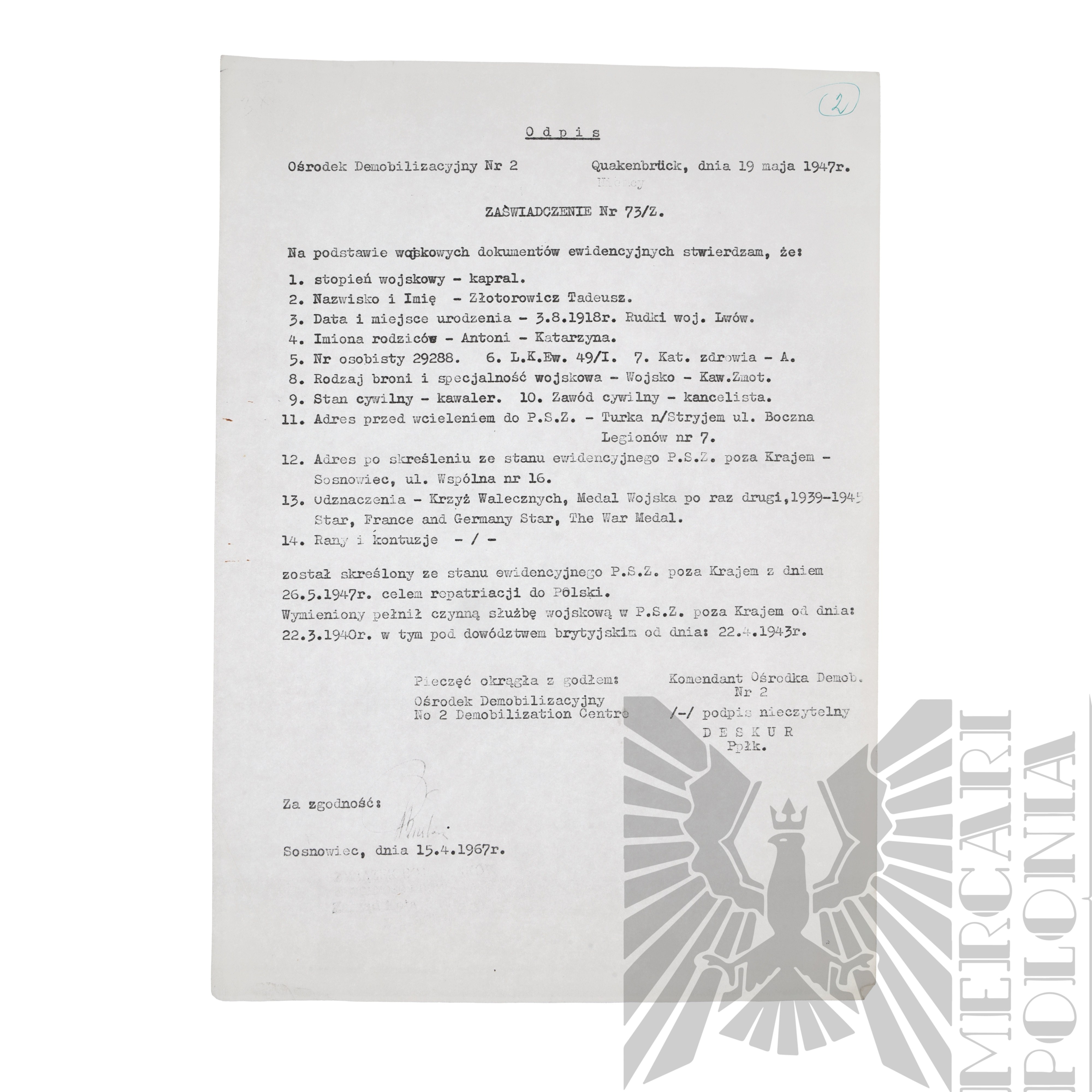 Tadeusz Złotrowicz urodzony 3 sierpnia 1918 roku pod Lwowem. Brał udział w Kampanii Wrześniowej w Batalionie Obrony Narodowej “TURKA” w Turce nad Stryjem. Przedostał się przez Węgierską granicę a następnie został internowany. Po przedostaniu się do Francji wstąpił do 1 Pułku Grenadierów Warszawy 1 Dywizji Grenadierów, gdzie pełnił funkcje strzelca ręcznego karabinu maszynowego, ranny dwukrotnie podczas przebijania się z niemieckiego okrążenia w bitwie pod Desseling za co w 1975 roku został odznaczony Srebrnym Krzyżem Orderu Virtuti Militari. Od 1940 roku przebywał w niewoli niemieckiej, w 1942 roku razem z dwoma kolegami uciekł z obozu jenieckiego a następnie przez Francję, Hiszpanię, Portugalię i Irlandię przedostał się do Wielkiej Brytanii, gdzie wstąpił w szeregi 10 Pułku Strzelców Konnych 1 Dywizji Pancernej. Przeszedł cały szlak bojowy od Normandii po Wilhelmshaven, za zniszczenie czołgu “Pantera” z odległości 50 metrów został odznaczony Krzyżem Walecznych oraz uczestniczył we wzięciu do niewoli generała Otto Von Elfelda, dowódcę 84 Korpusu. Pełnił on funkcje radiooperatora czołgowego a następne dowódcy czołgu. Po wojnie ukończył kurs w gimnazjum kupieckim 1 Dywizji Pancernej a w 1947 roku wrócił do kraju i zamieszkał w Sosnowcu, bardzo aktywnie działał w organizacjach kombatanckich.