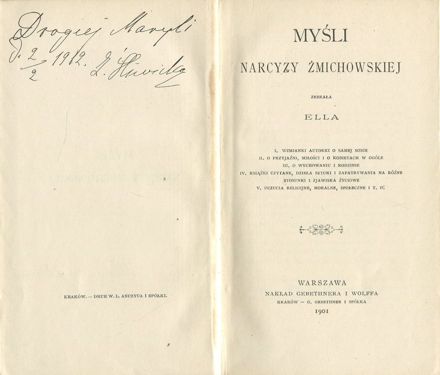 Warszawa 1901. Gebethner i Wolff. 9x16,5 cm, str. (4), 346, (1), płócienna oprawa wydawnicza ze złoceniami. Stan bardzo dobry (obca dedykacja, minimalne otarcia oprawy).