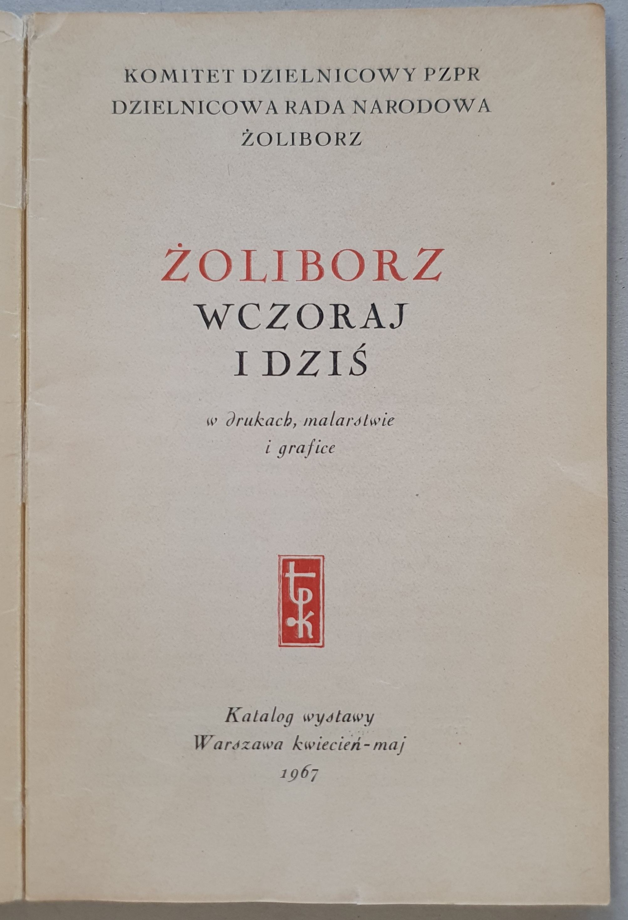 Żoliborz wczoraj i dziś w drukach, malarstwie i grafice. Katalog wystawy, Warszawa kwiecień - maj 1967. Komitet Dzielnicowy PZPR Dzielnicowa Rada Narodowa Żoliborz. Zakład Graficzny BN. Zam. Nr 91/67. T-91. Broszura wydawnicza, 72 s., format: 17 cm.