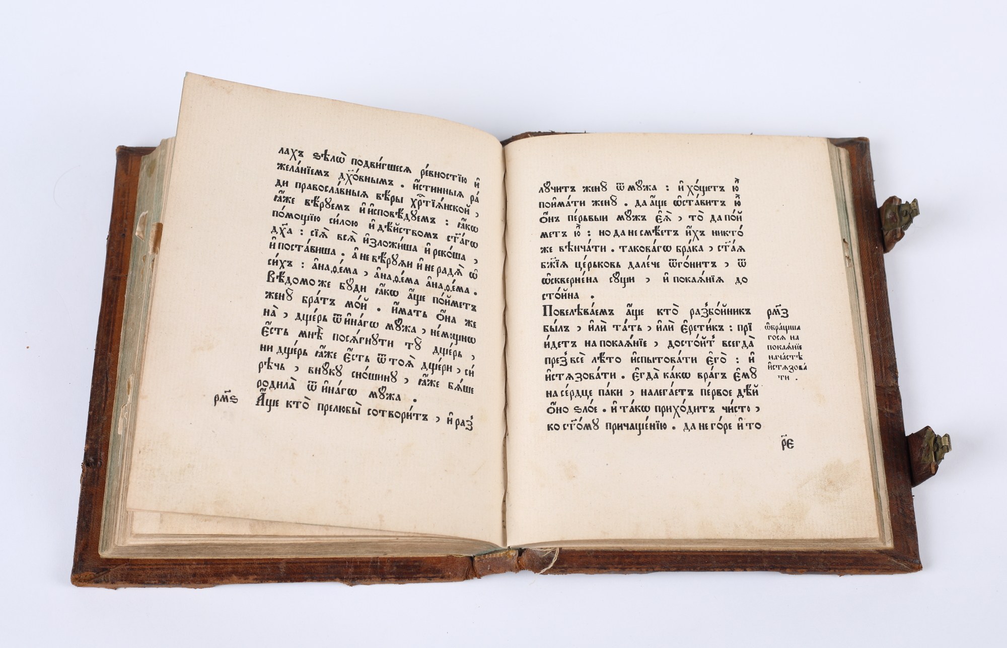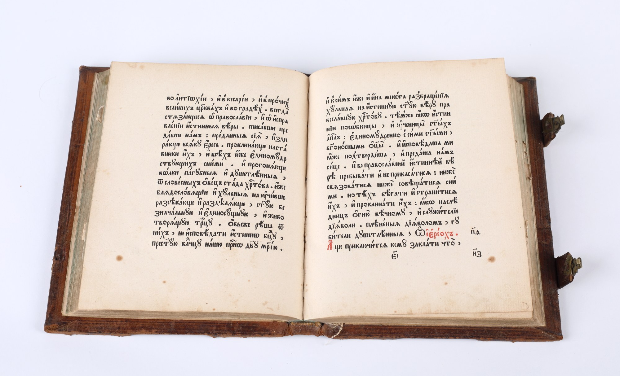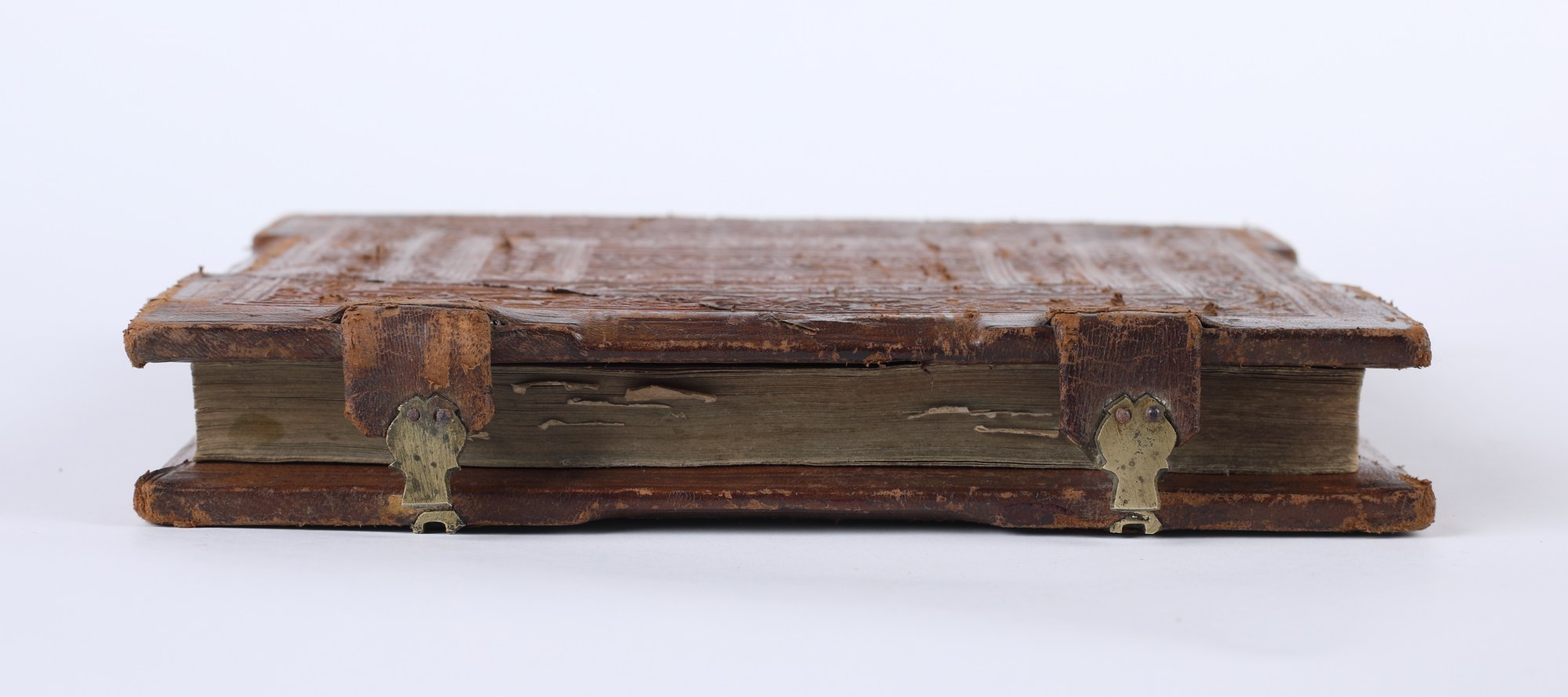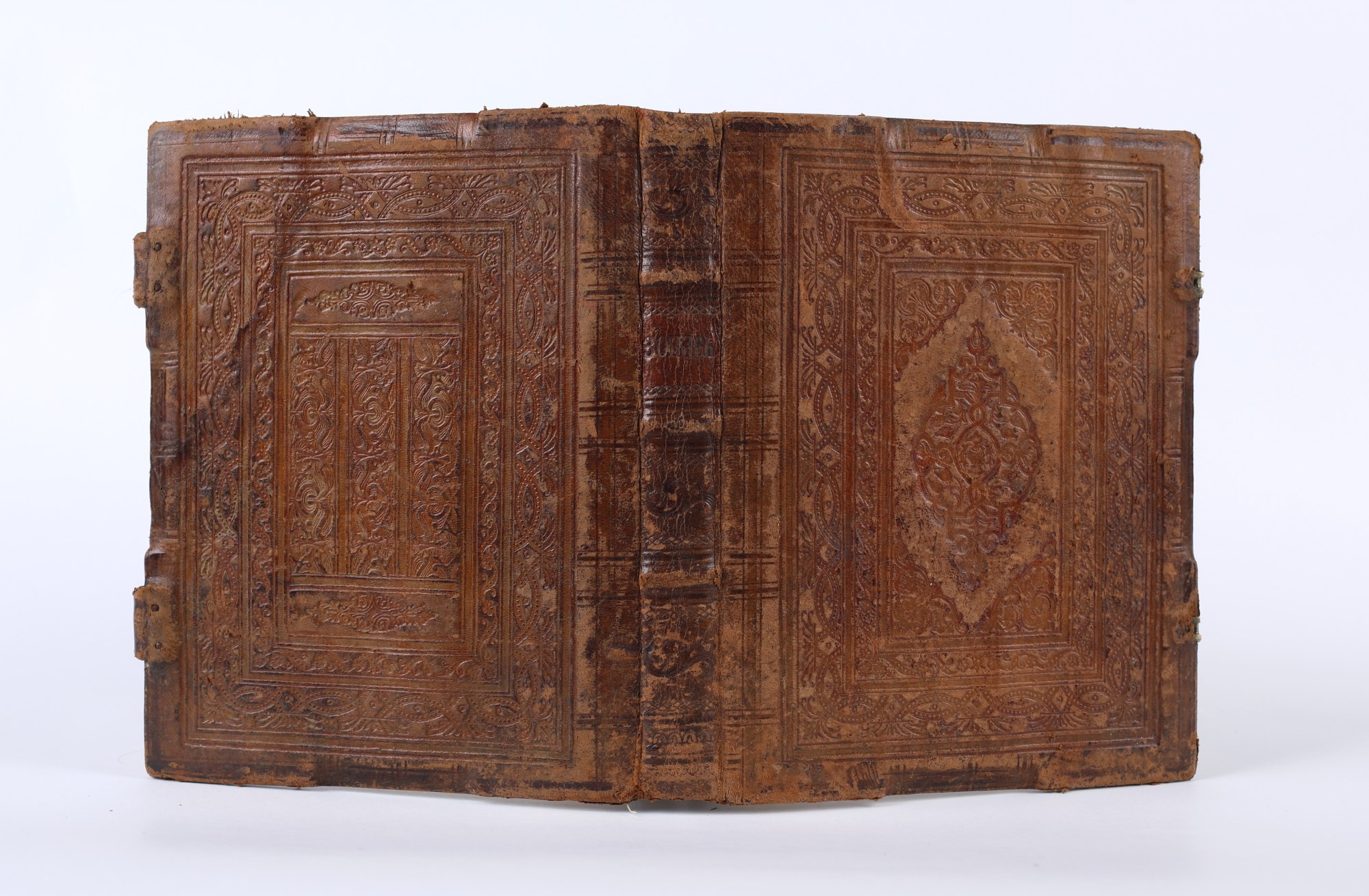 S. 138. Wys. 23 cm. Oprawa skóra, deska z epoki. Okładki ślepo tłoczone i zdobione. Zachowane oryg. zapięcia. Na ostatniej karcie wpis własn. w jęz. rosyjskim z 1914 roku. Drobne przetarcia oprawy, gdzieniegdzie zaplamienia.