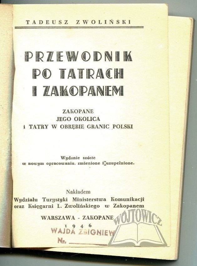 Zakopane, jego okolica i Tatry w obrębie granic Polski. Wyd. 6 w nowym opracowaniu, zmienione i uzupełnione. Warszawa, Zakopane 1946. Nakł. Wydziału Turystyki Ministerstwa Komunikacji oraz Księgarni L. Zwolińskiego w Zakopanem. 8, s. 187, [4], okł. oryg. brosz.