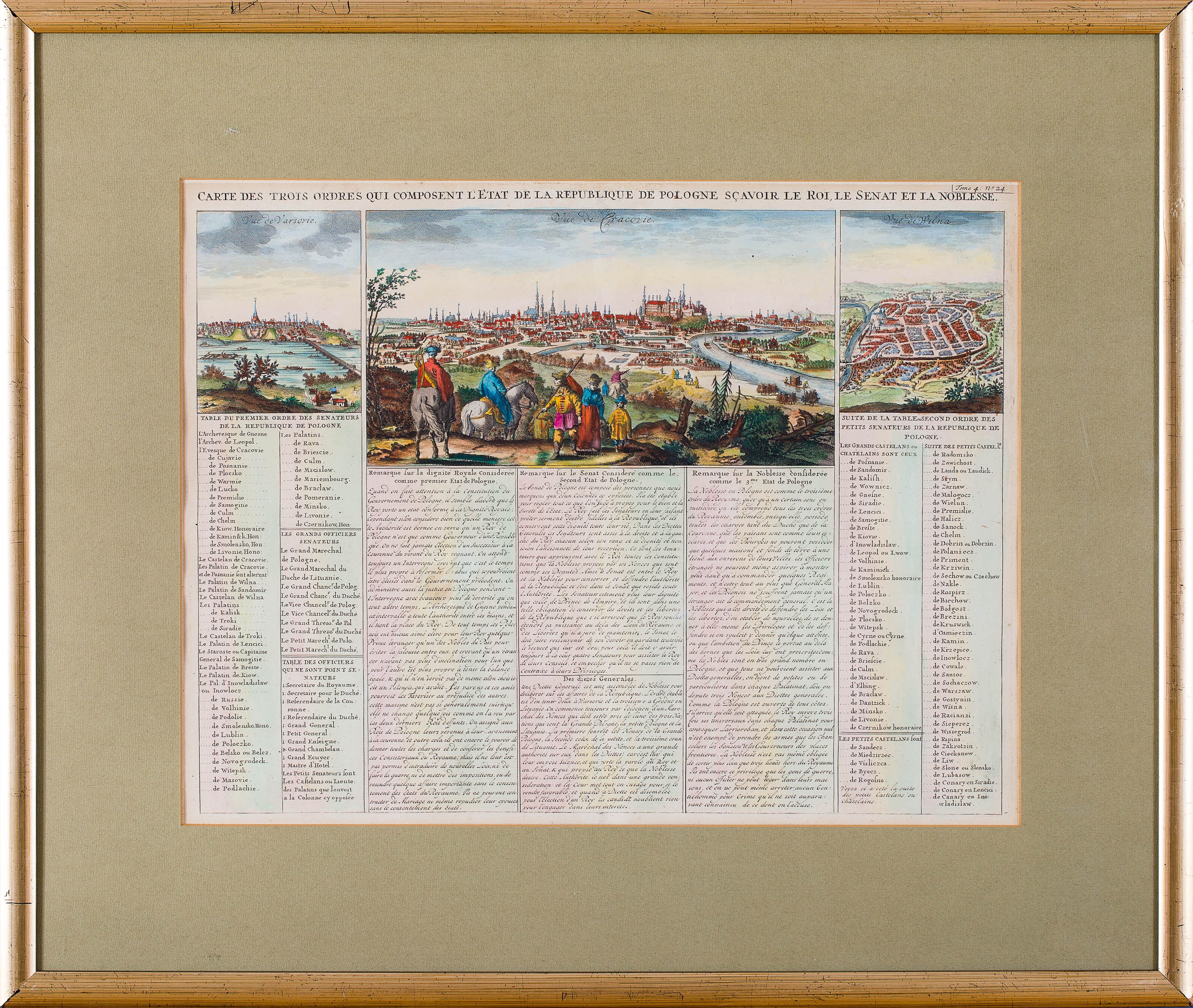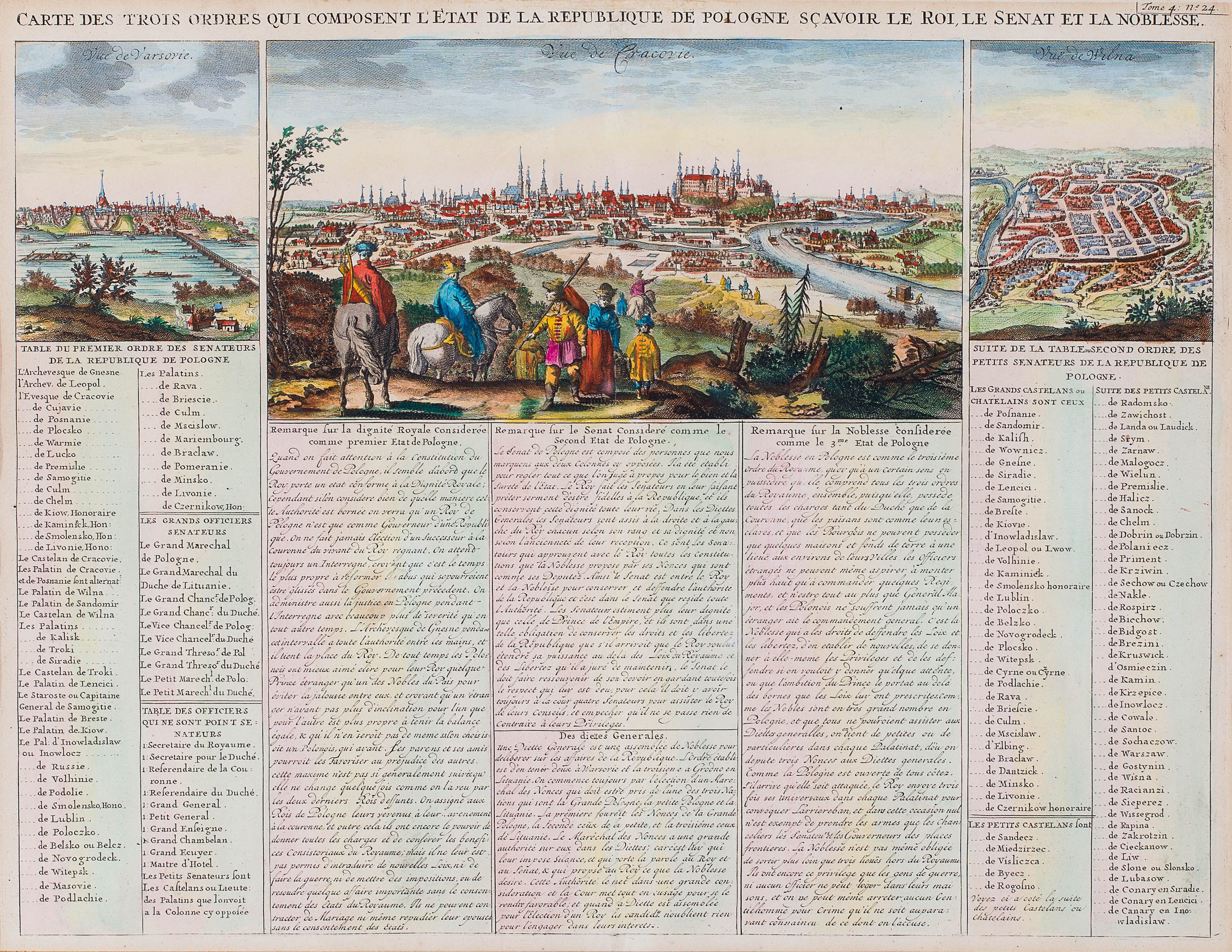 U góry ryciny przedstawiające panoramy Warszawy, Krakowa i Wilna, poniżej część opisowa dotycząca sytemu politycznego Rzeczpospolitej z podziałem na trzy stany (król, senat, szlachta), Amsterdam, 1735