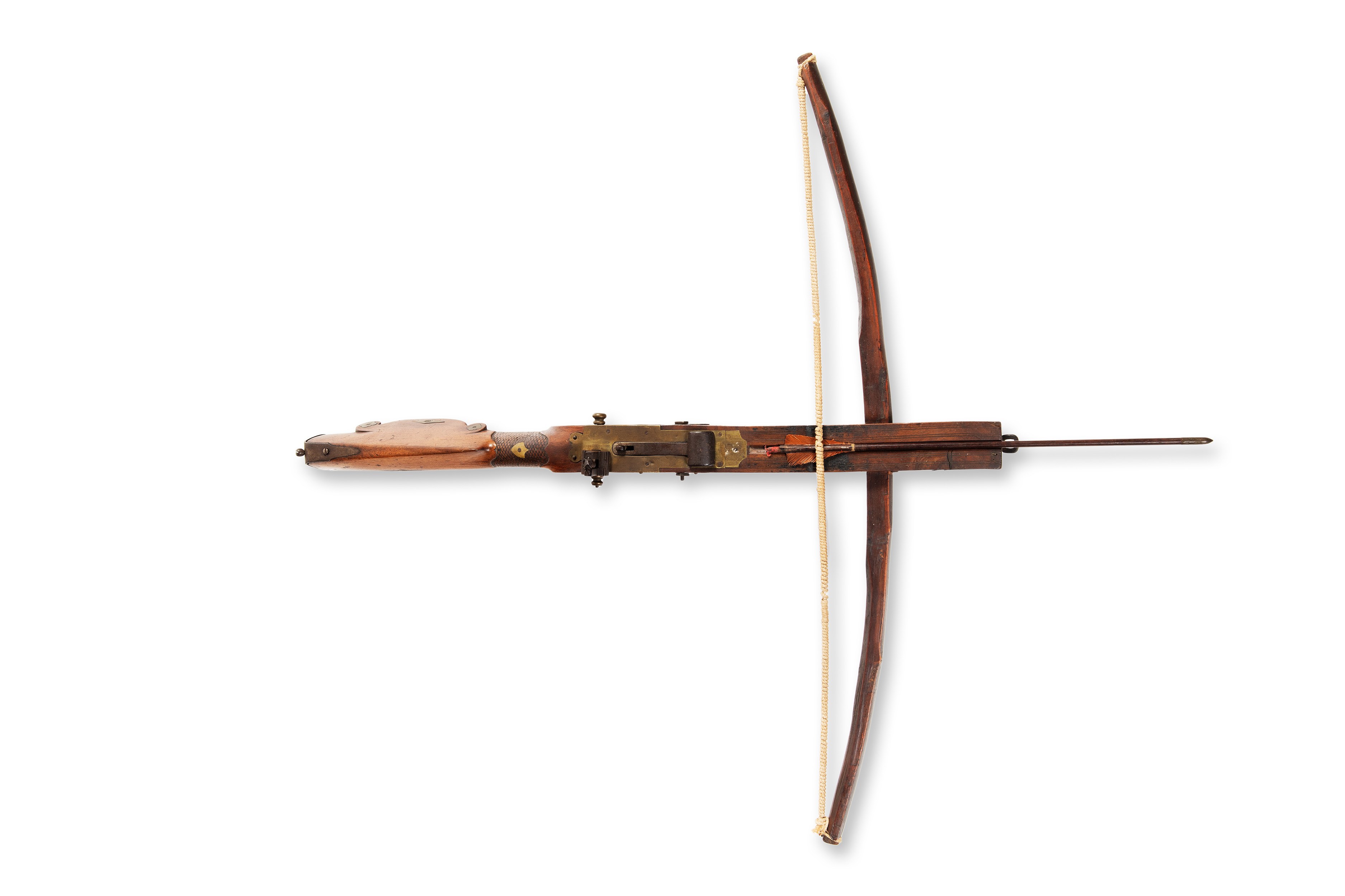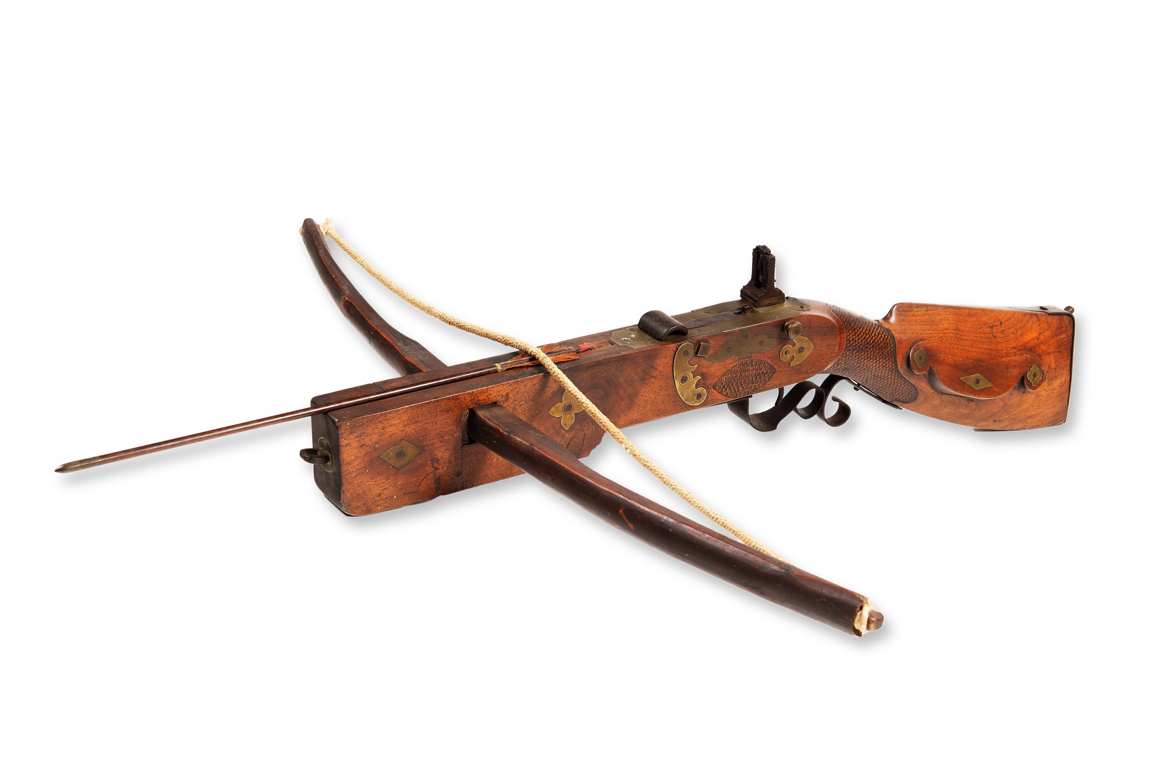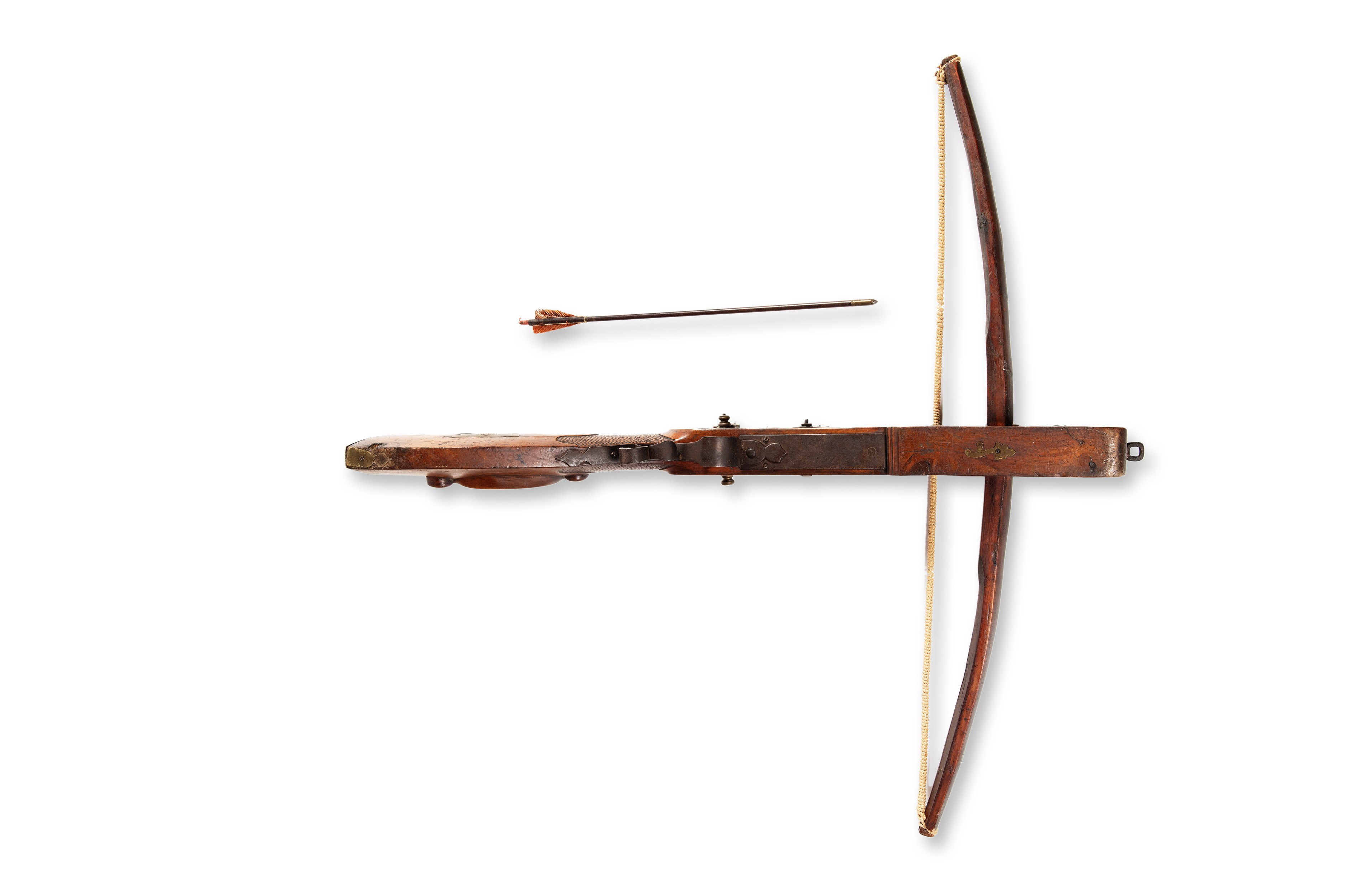 Sporting crossbow from around 1870, made in Europe. This model represents a sports crossbow from the end of the 19th century with an arch span of 800 mm. The stock is wooden, which is typical of weapons of this period, and the string is new, indicating that the crossbow has been kept in good condition. The crossbow is in original condition, meaning it has not been significantly modified or refurbished. This piece is an example of quality craftsmanship from the 19th century period and is ideal for the collector of vintage sporting arms.***IMPORTANT NOTICE***