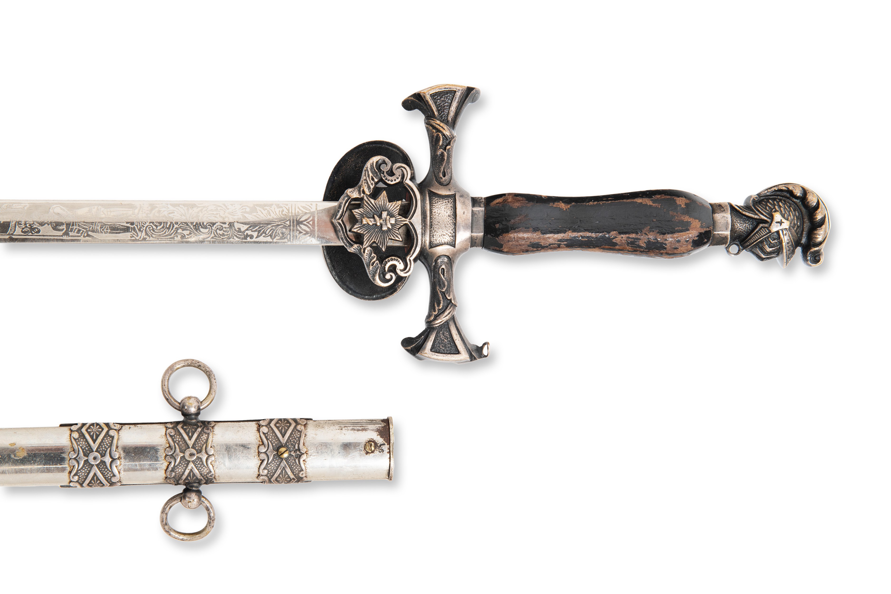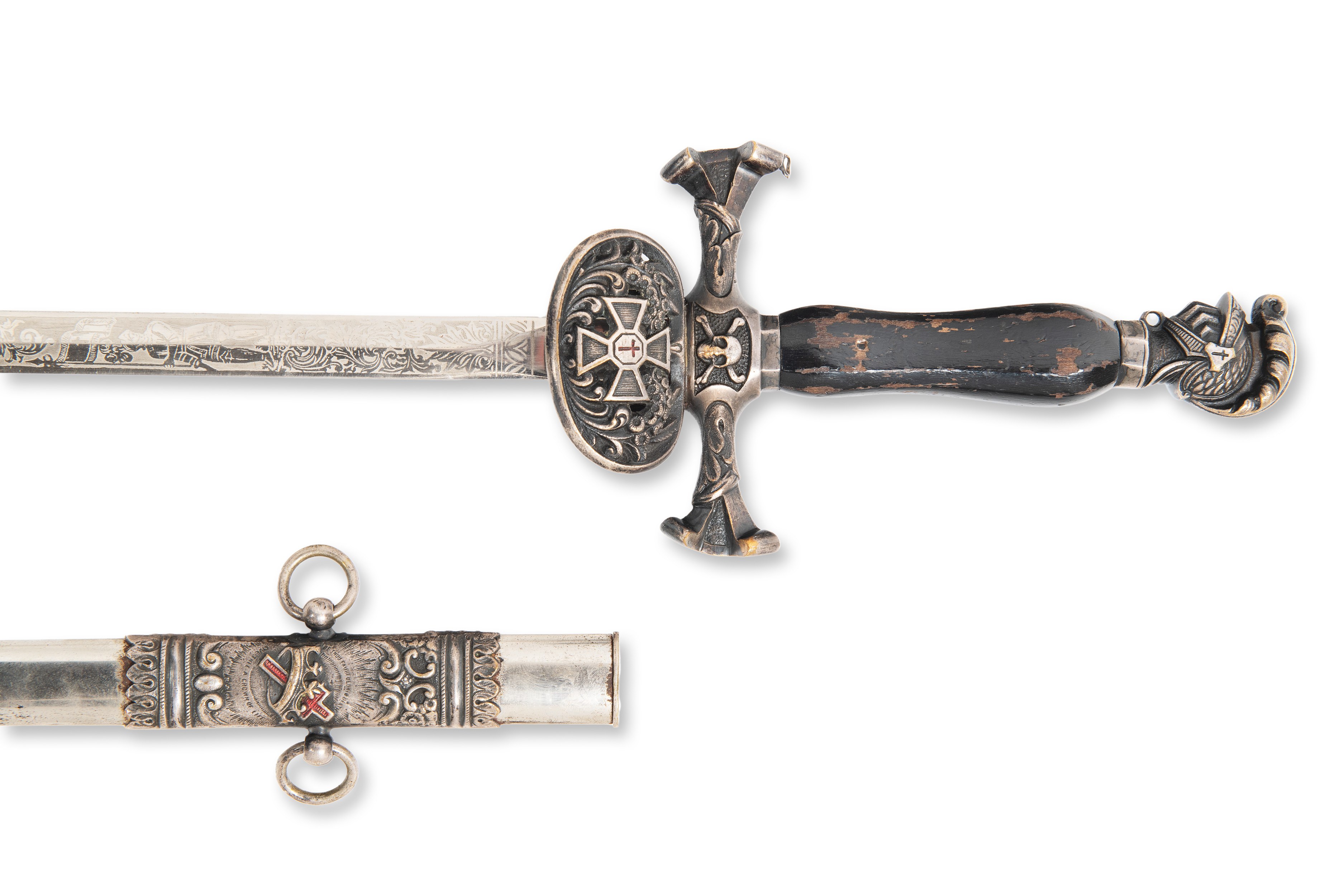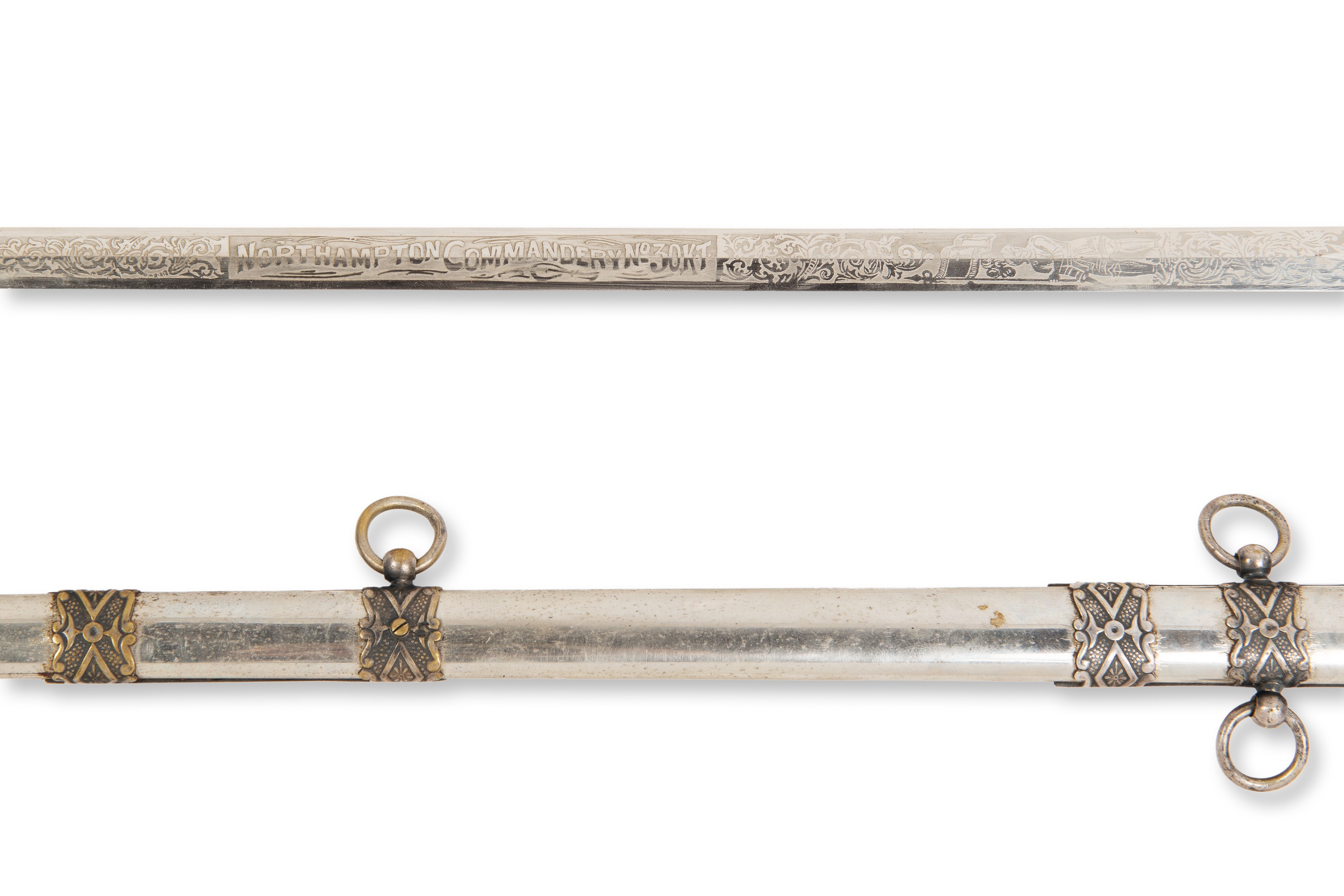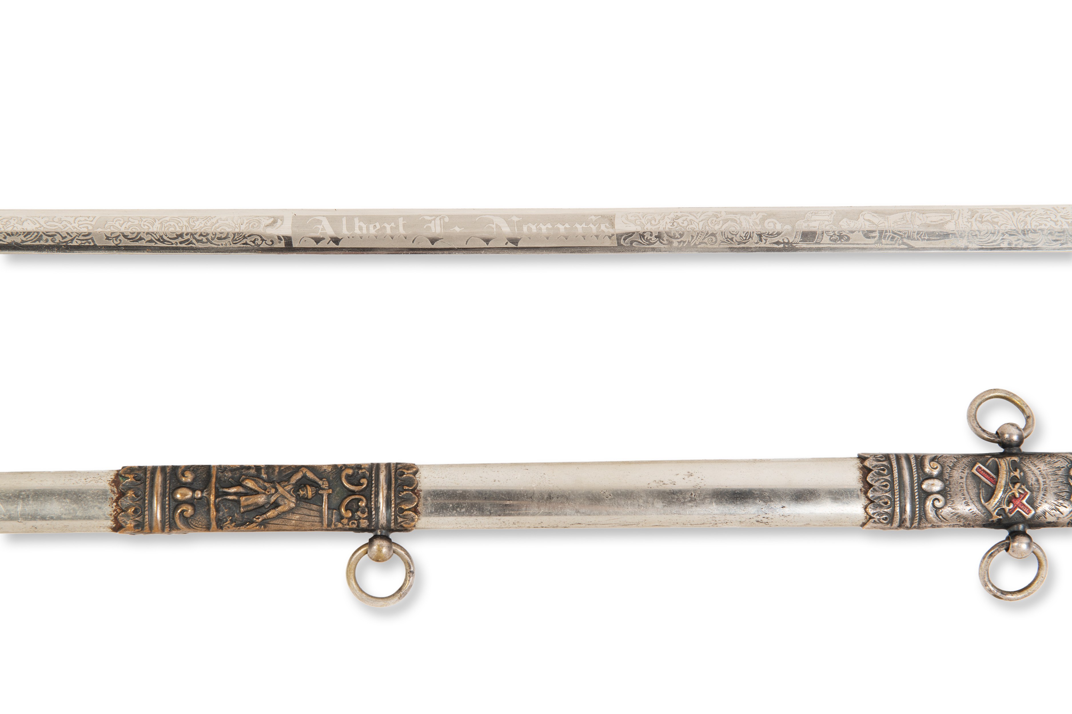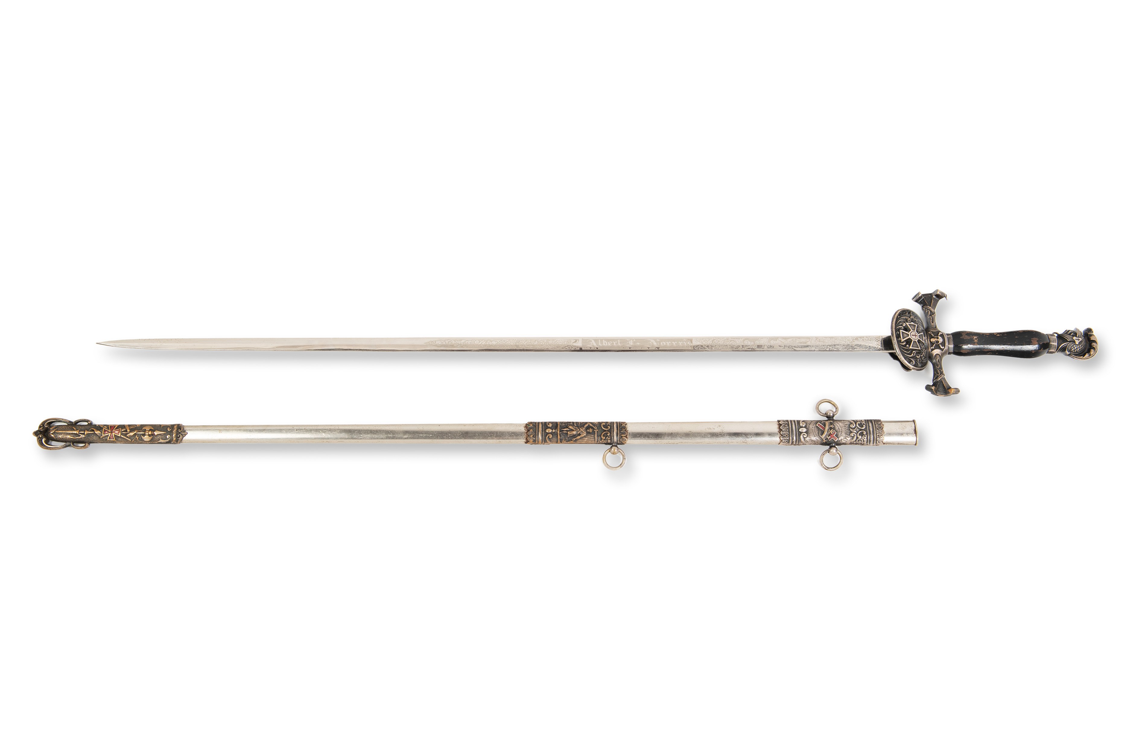 Knights Templar ceremonial sword from the late 19th century, made in the USA. This sword is signed "Albert J. Norris" and marked "Northampton Commandery No. 30 K.T." on the blade. This ceremonial sword was used by the Knights Templar and was part of the rituals and ceremonies within the knightly orders. The scabbard is included, and the sword is in excellent condition, indicating its careful maintenance and preservation. This piece is an excellent example of a historical weapon that was not only functional, but also an important symbol of power and prestige in the social context of the time.***IMPORTANT NOTICE***