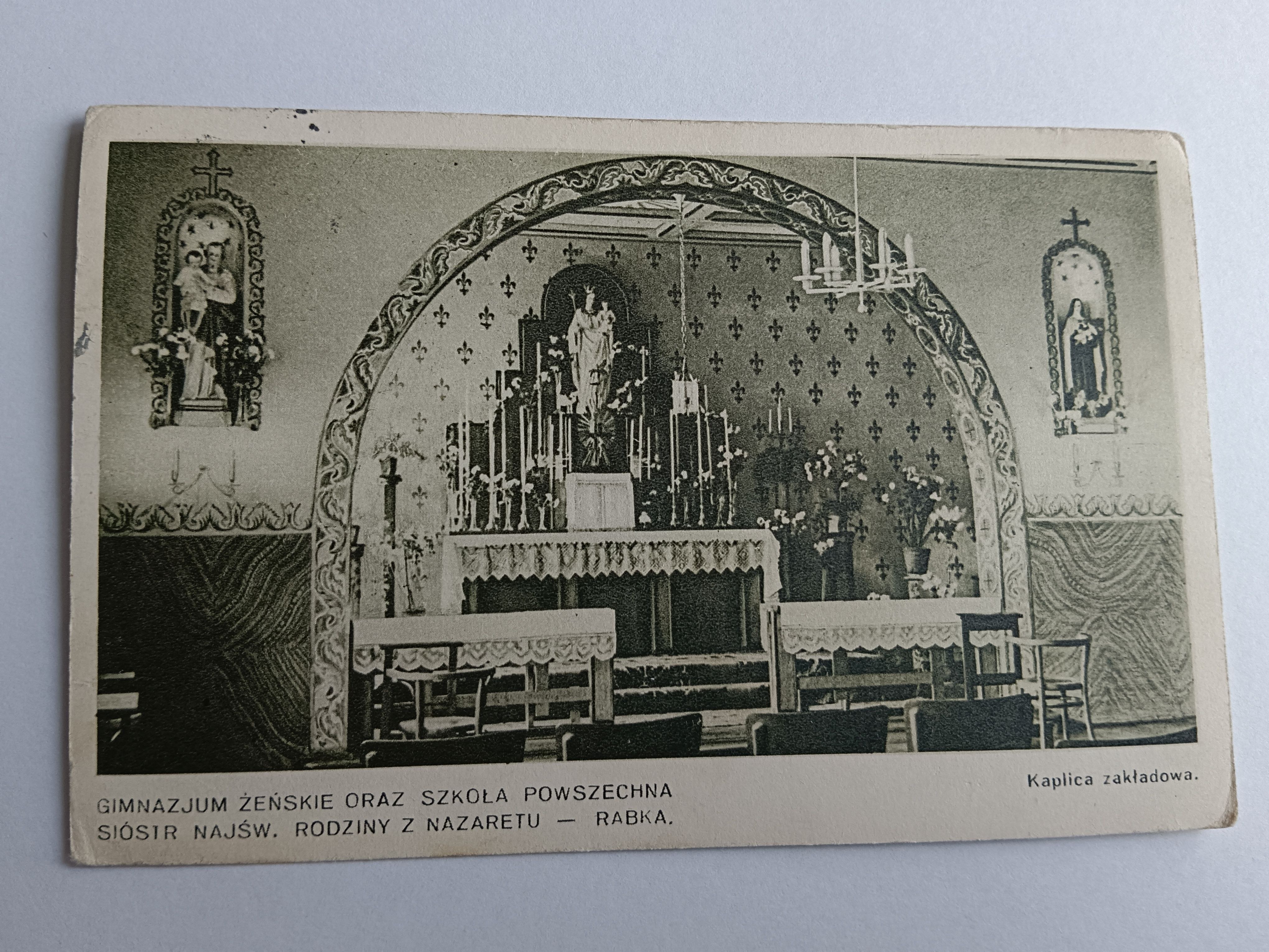 POCZTÓWKA RABKA, GIMNAZJUM ŻEŃSKIE SZKOŁA POWSZECHNA SIÓSTR NAJŚW RODZINY Z NAZARETU KAPLICA ZAKŁADOWA, PRZEDWOJENNA, ZNACZEK, STEMPEL