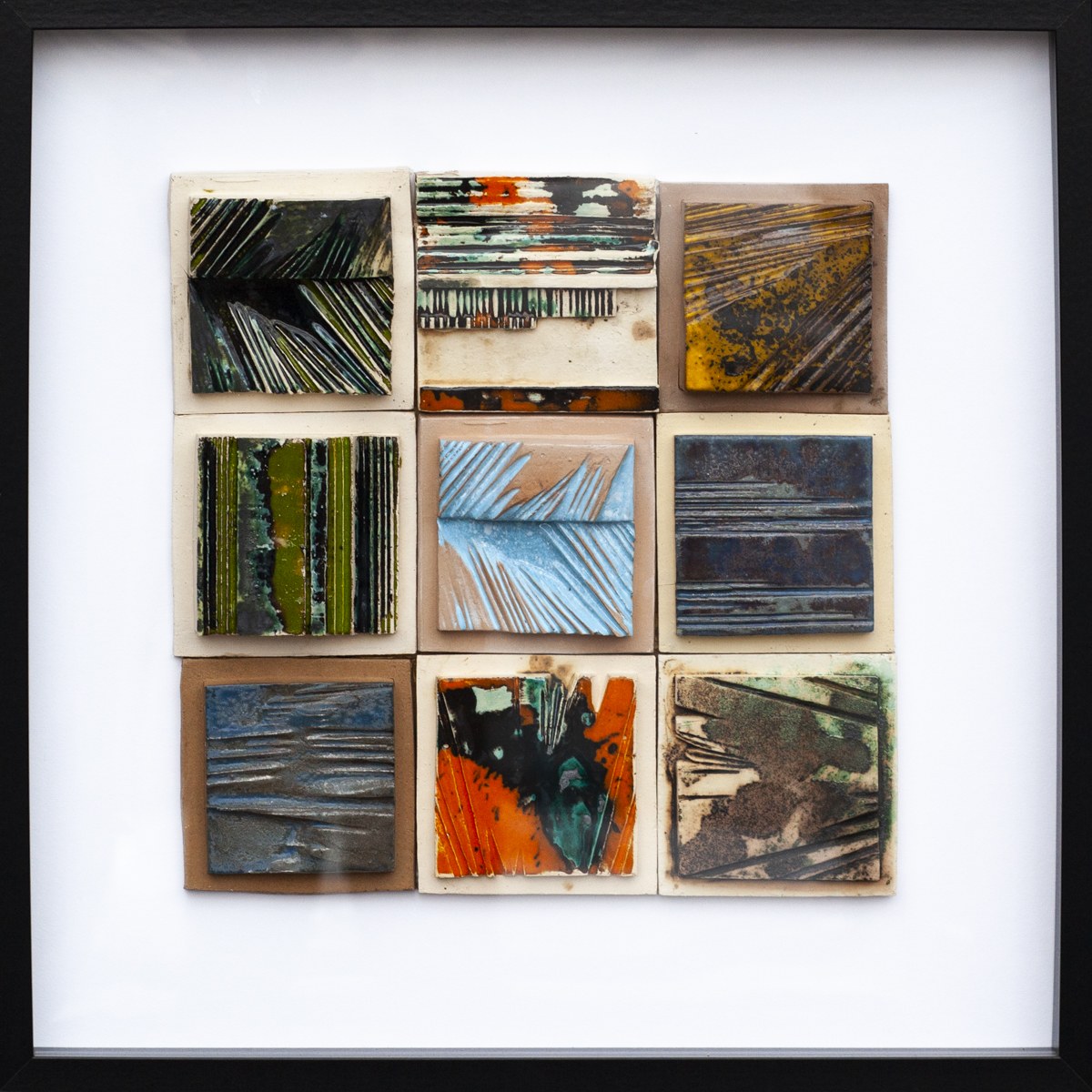 ceramika szkliwiona, 34x34 cm kompozycja, 52,5x52,5 cm w oprawie