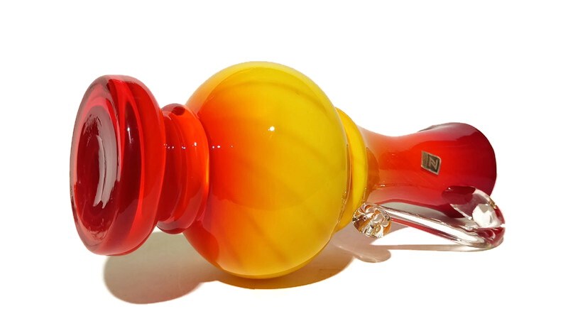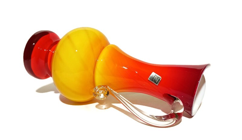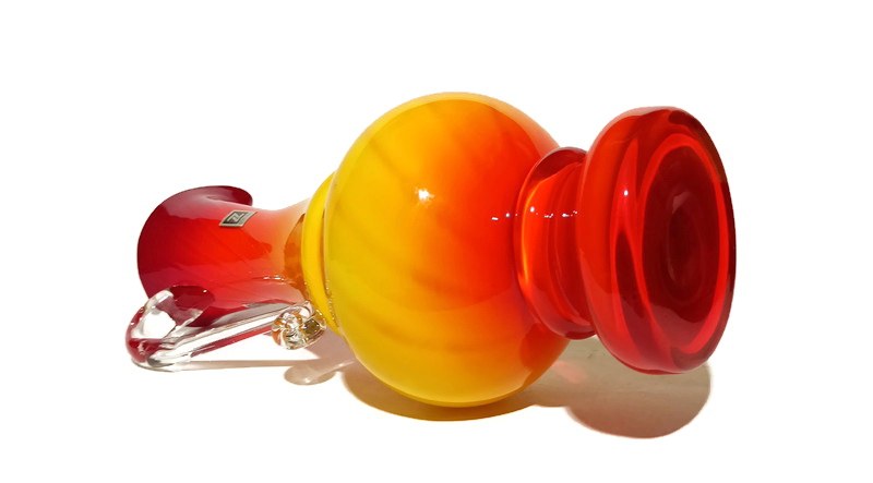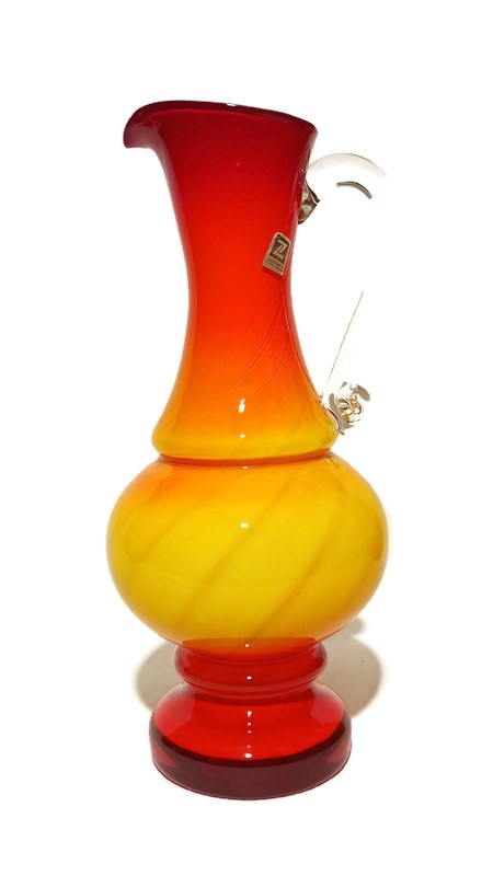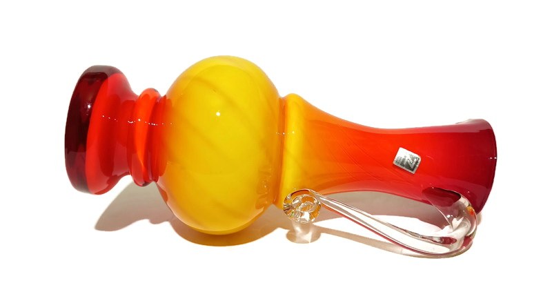 szkło sodowe, barwione w masie, intensywne przejściowe kolory, szkło kanelowane zewnętrznie, wewnątrz mleczne, ozdobne bezbarwne ucho zakończone ślimakiem, zachowana nalepka producenta z napisem "ZĄBKOWICE POLAND POLOGNE",