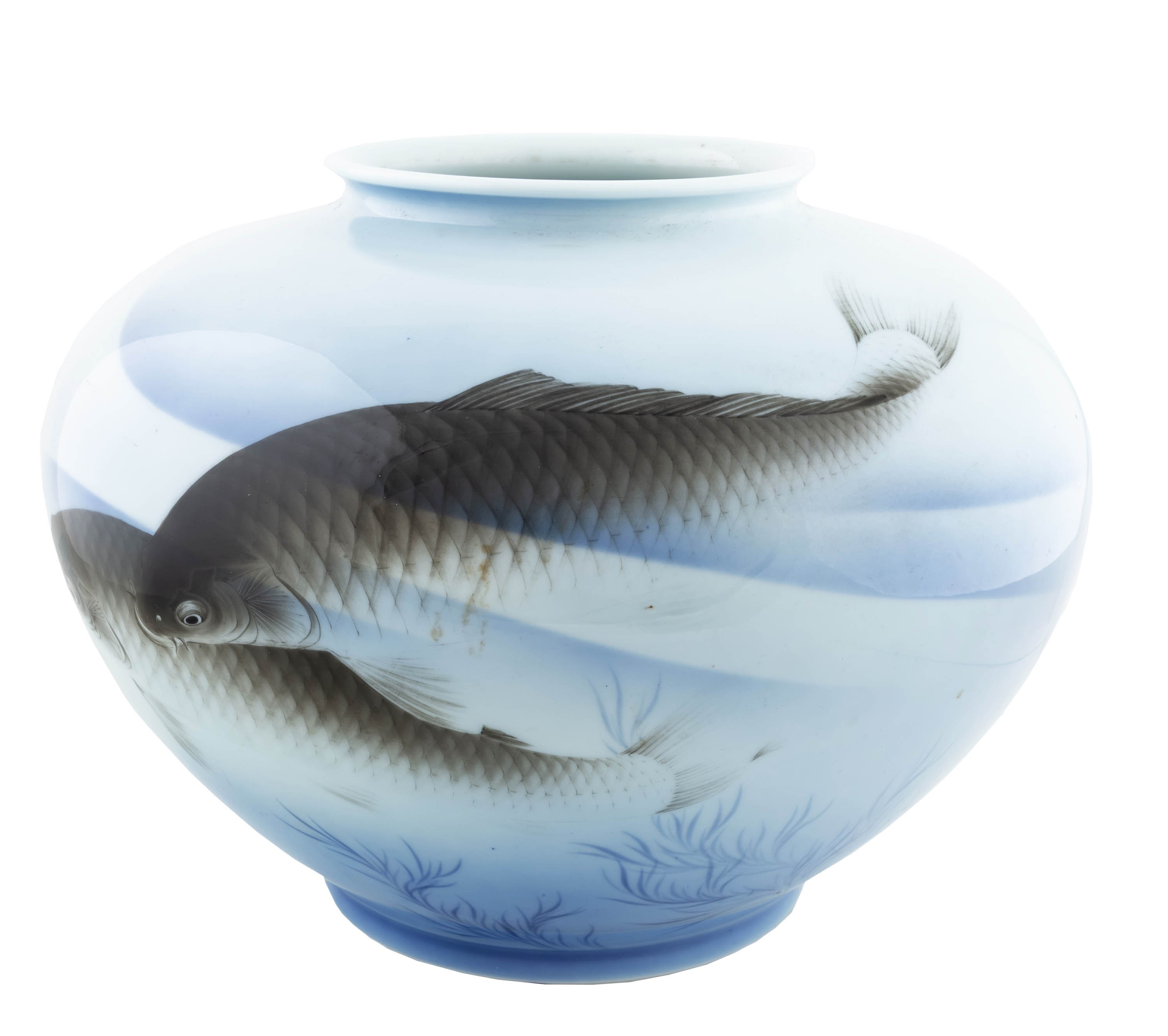 porcelana, ręcznie malowana podszkliwnie, dekoracja z karpiami, wys. 22 cm, śr. 31 cm