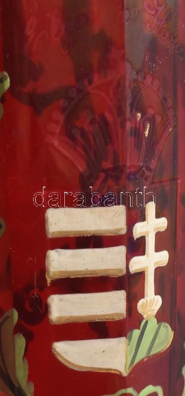 Emlékpohár. cca 1850/70, Parád, bíborpácolt, zománcfestett üveg, lapokra fazettált pohártest, festett kartusban fakult "Emlékül" felirattal, túloldalán babérágak között "Éljen a haza" felirattal és címerábrázolással. Kis kopással, kis ütődésnyommal, m: 13,5 cm