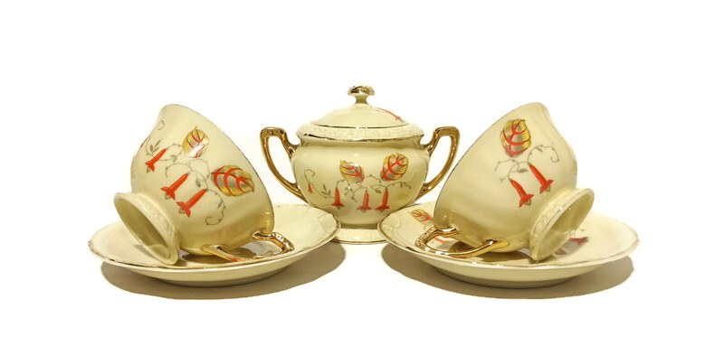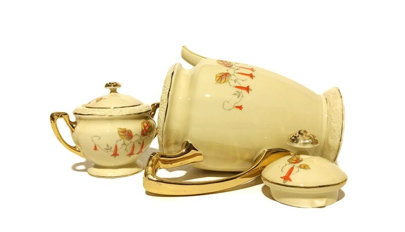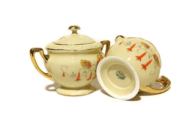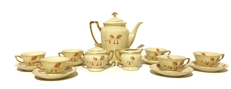 porcelana szkliwiona, złocenia, ozdobne ornamenty kwiatowe, wszystkie elementy sygnowane, bardzo cienka porcelana (filiżanki "pod światło" lekko prześwitujące), zestaw kompletny: dzbanek z pokrywką (19cm), mlecznik (6,5cm), cukiernica z pokrywką (8cm), 6 filiżanek (średnica 7,8cm), 6 talerzyków (średnica 11,5cm)