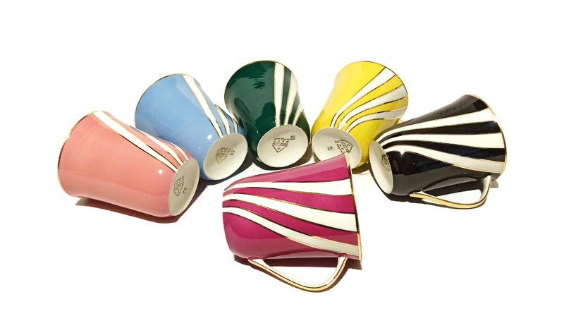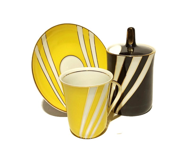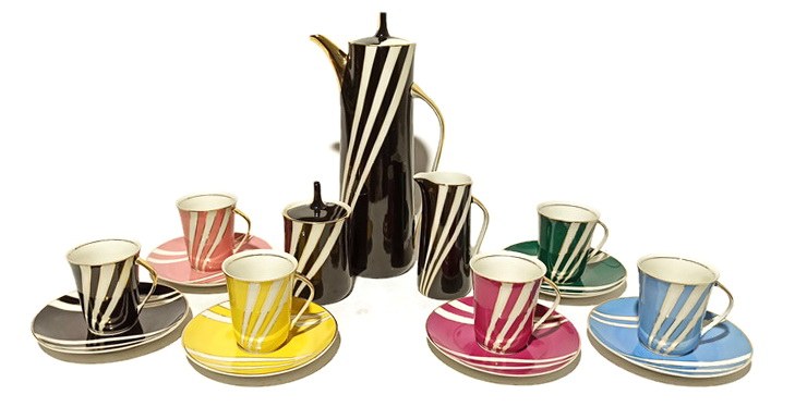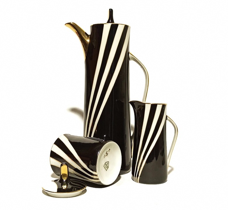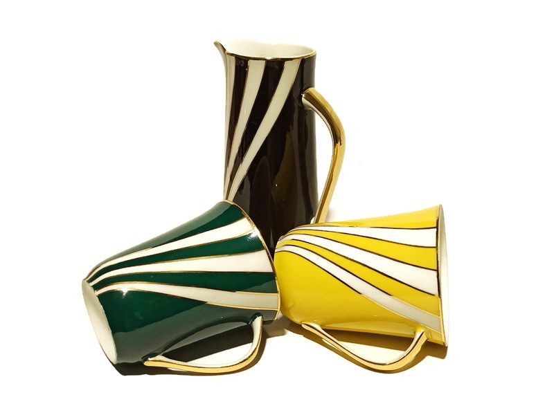 zestaw na 6 osób: dzbanek (19cm, średnica 14,5cm) z pokrywką, mlecznik (11cm), cukiernica (13cm, średnica 12cm) z pokrywką, 6 filiżanek (średnica 10cm), 6 spodków (średnica 15cm),