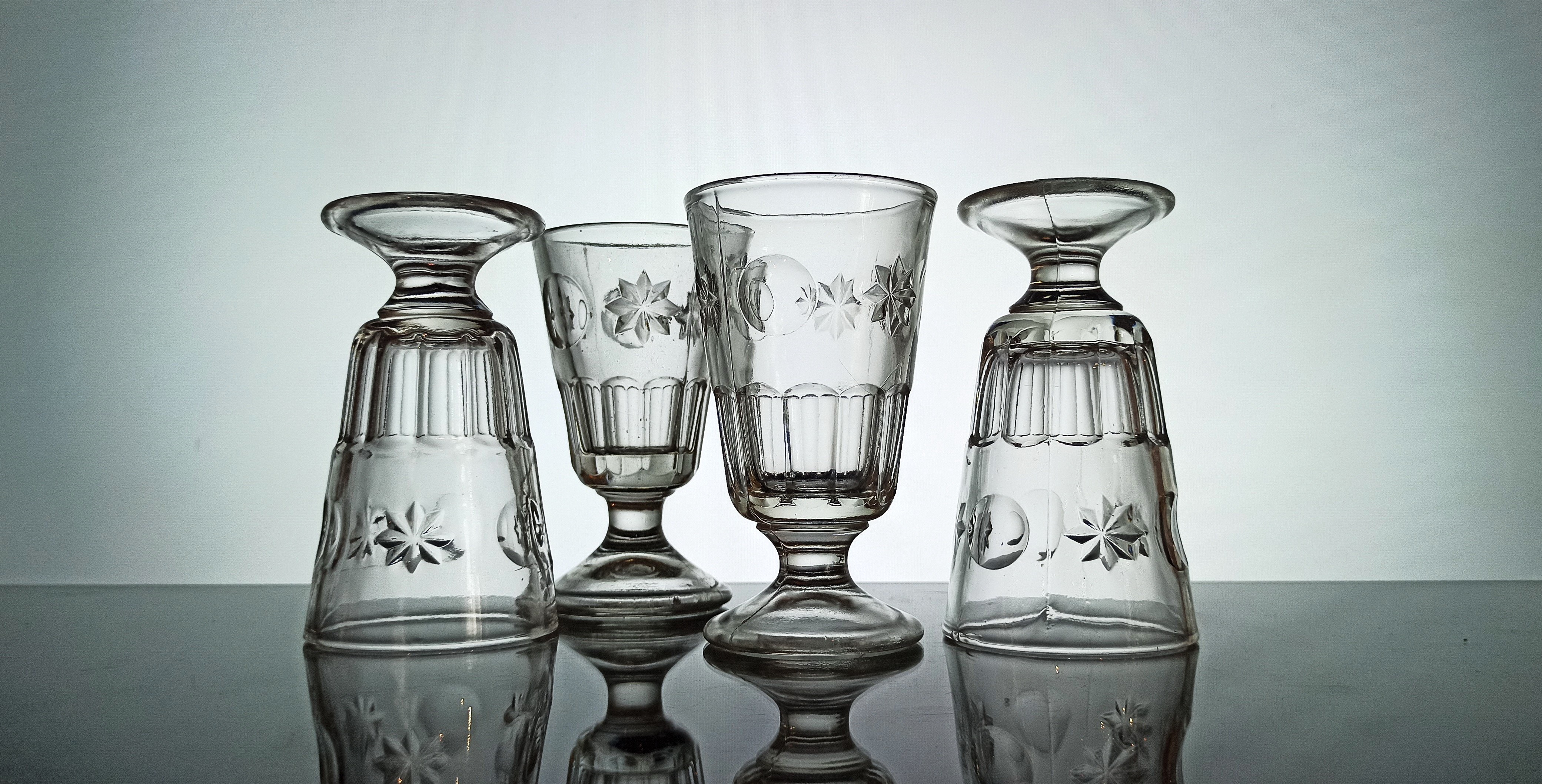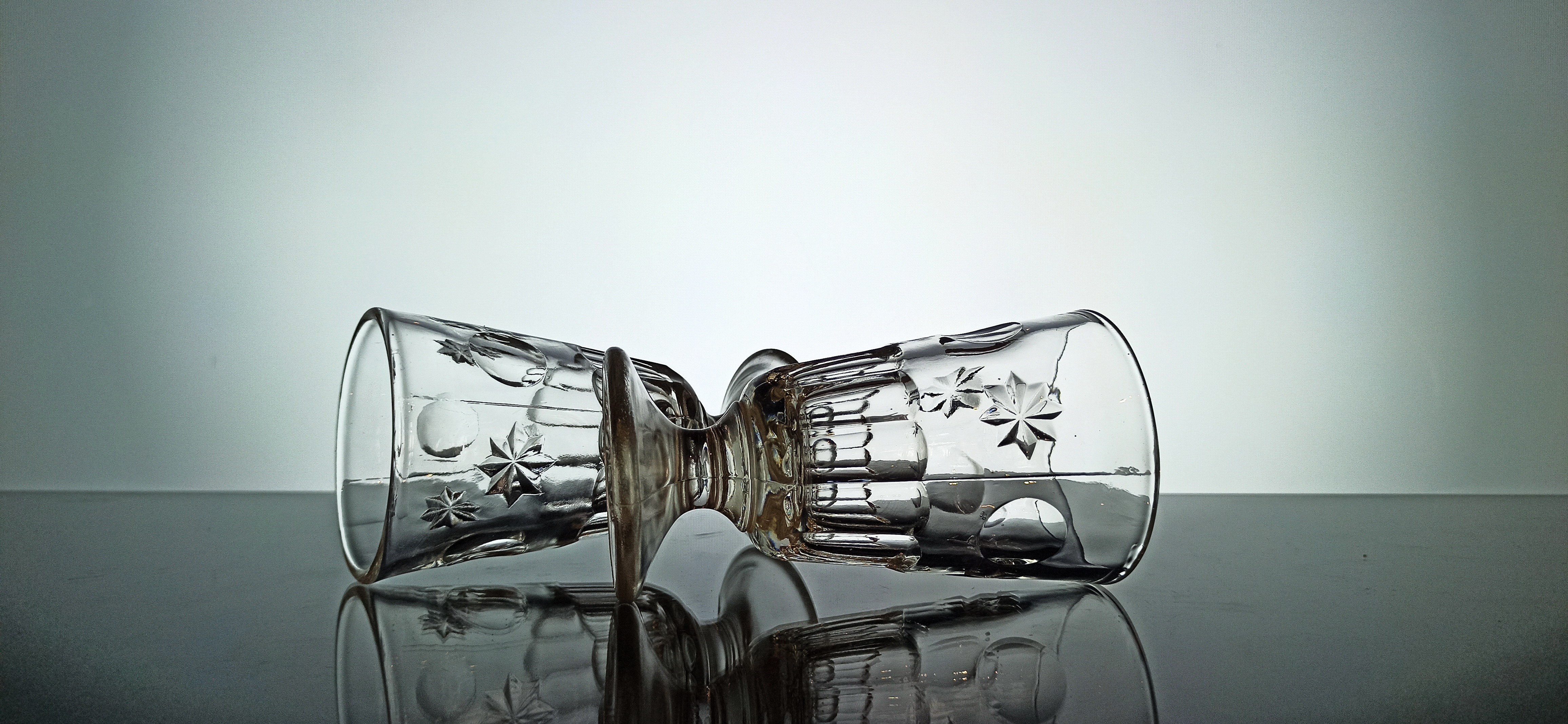 szkło prasowane bezbarwne, wysokość 13cm, średnica 7,3cm, stan bardzo dobry, jeden mały ubytek na obrzeżu podstawy, pozostałe elementy w stanie bardzo dobrym