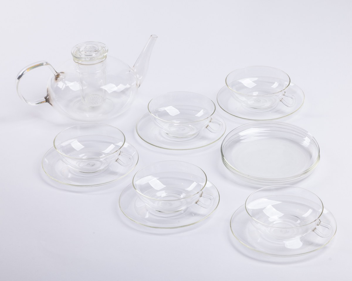 proj. Wilhelm Wagenfeld, lata 50. XX w., ręcznie wykonany, cienkie szkło przezroczyste typu Jena Glass