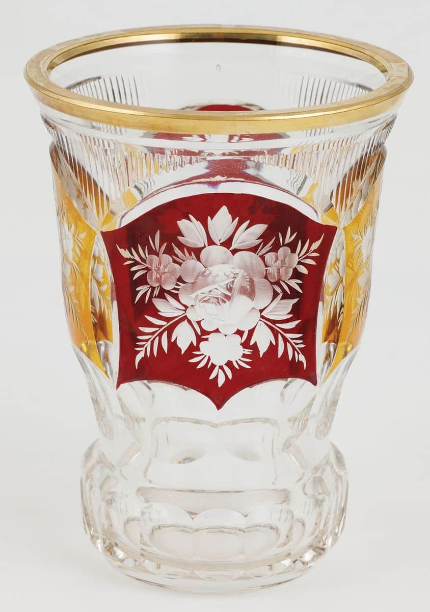 Szkło bezbarwne, lazurowane rubinowym i miodowym, szlifowane, złocone, wys. 12 cm