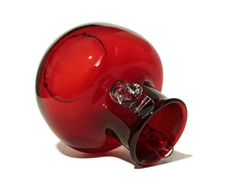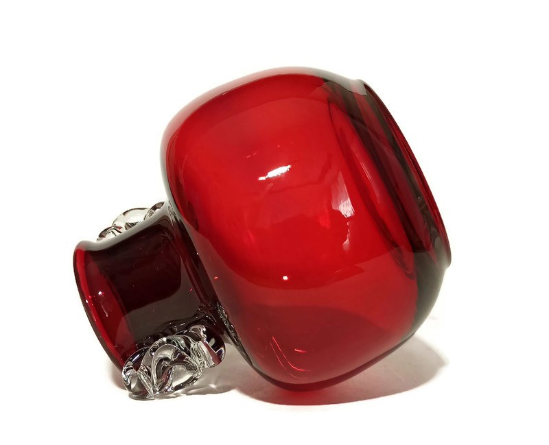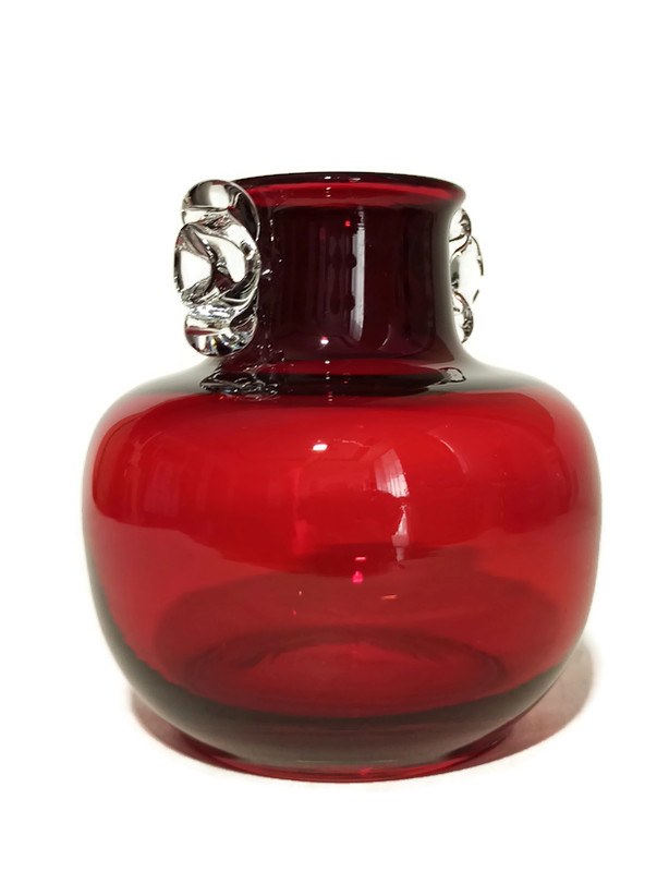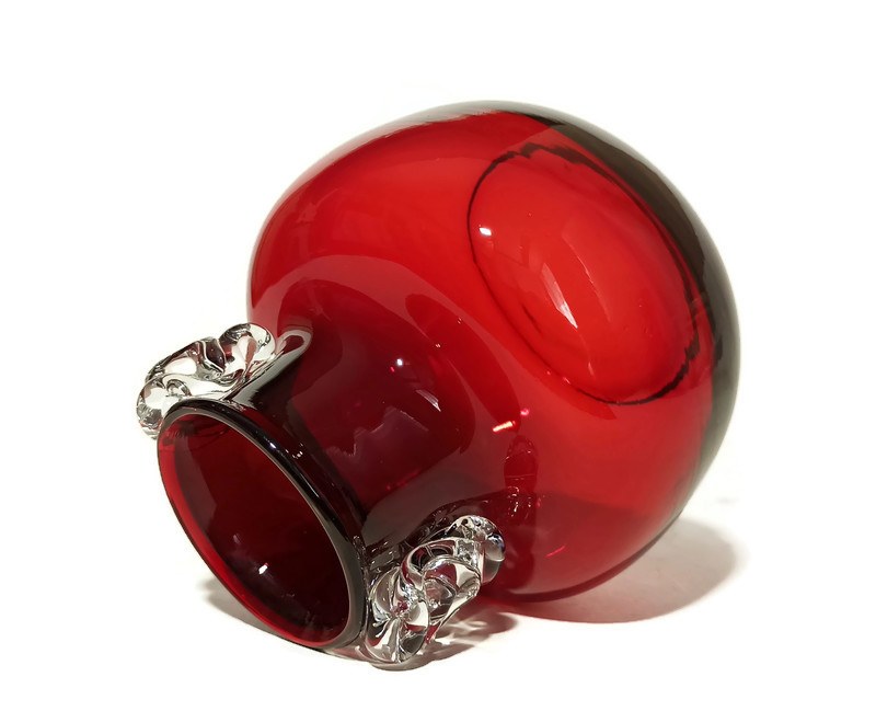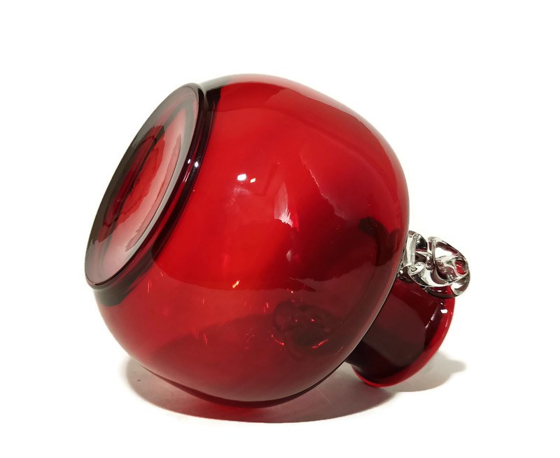 szkło barwione w masie, kolor rubinowy, ciemniejący ko podstawie i wlewie, bezbarwne ozdobne elementy, wysokość 14cm