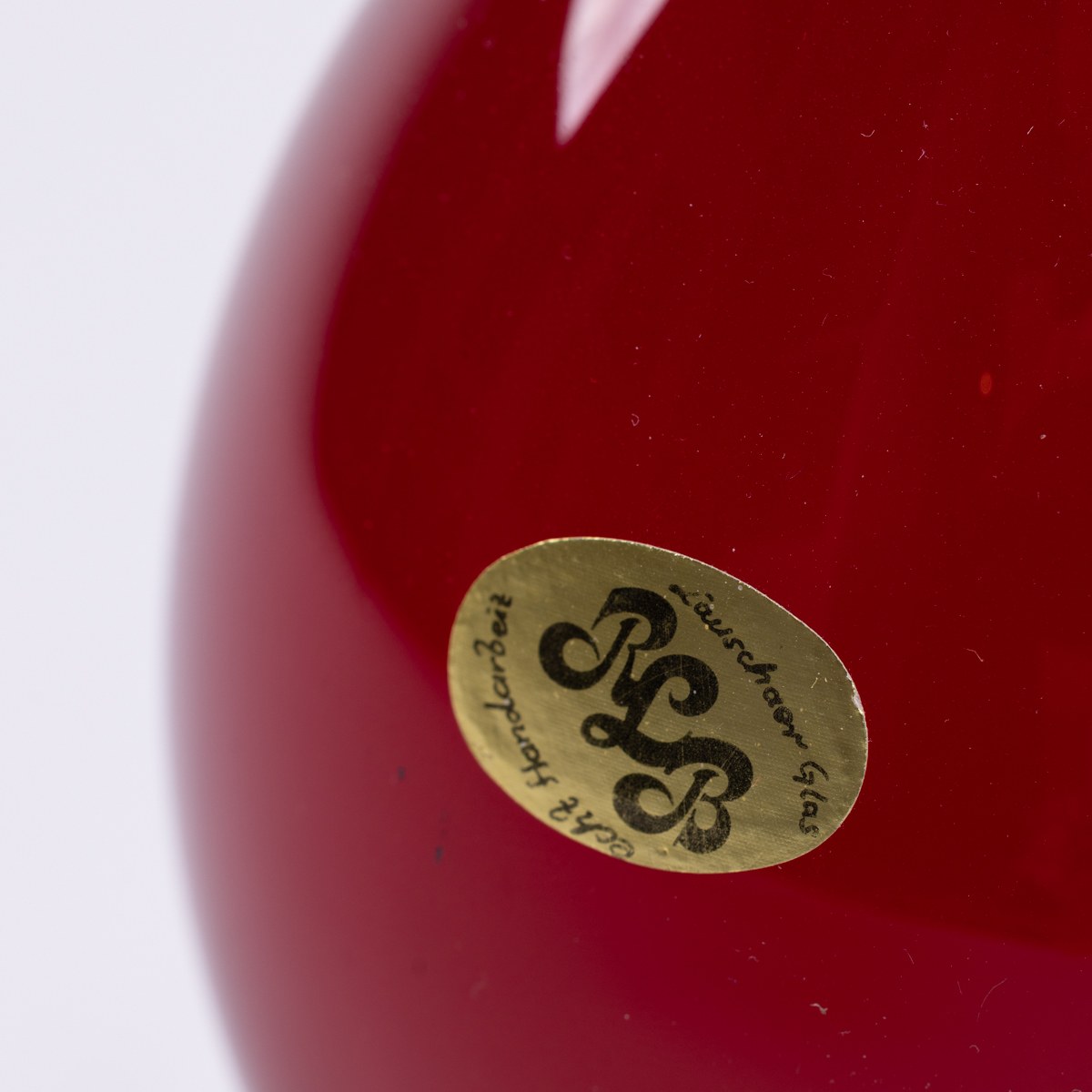 szkło dmuchane, ręcznie formowane, barwione w masie, wys. 25 cm, śr. wlewu 2,5 cm, śr. brzuśca 8 cm, zachowana oryginalna nalepka