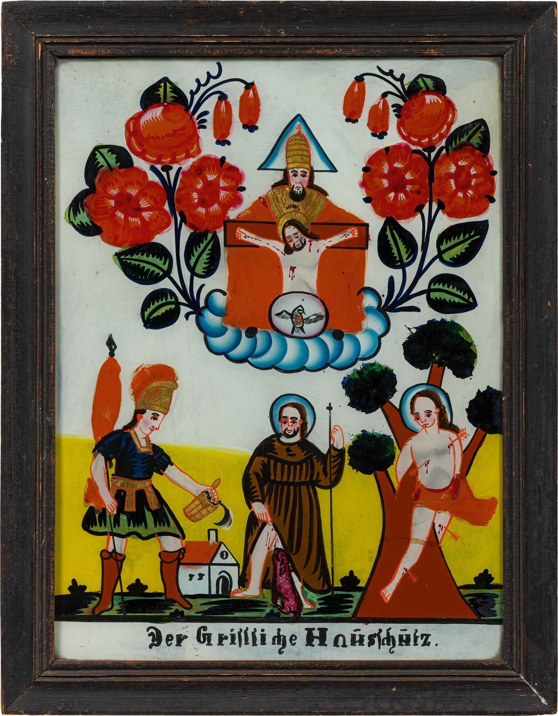 painting behind glass, partially gilded; inscription "the gristliche Hausschutz"; framed