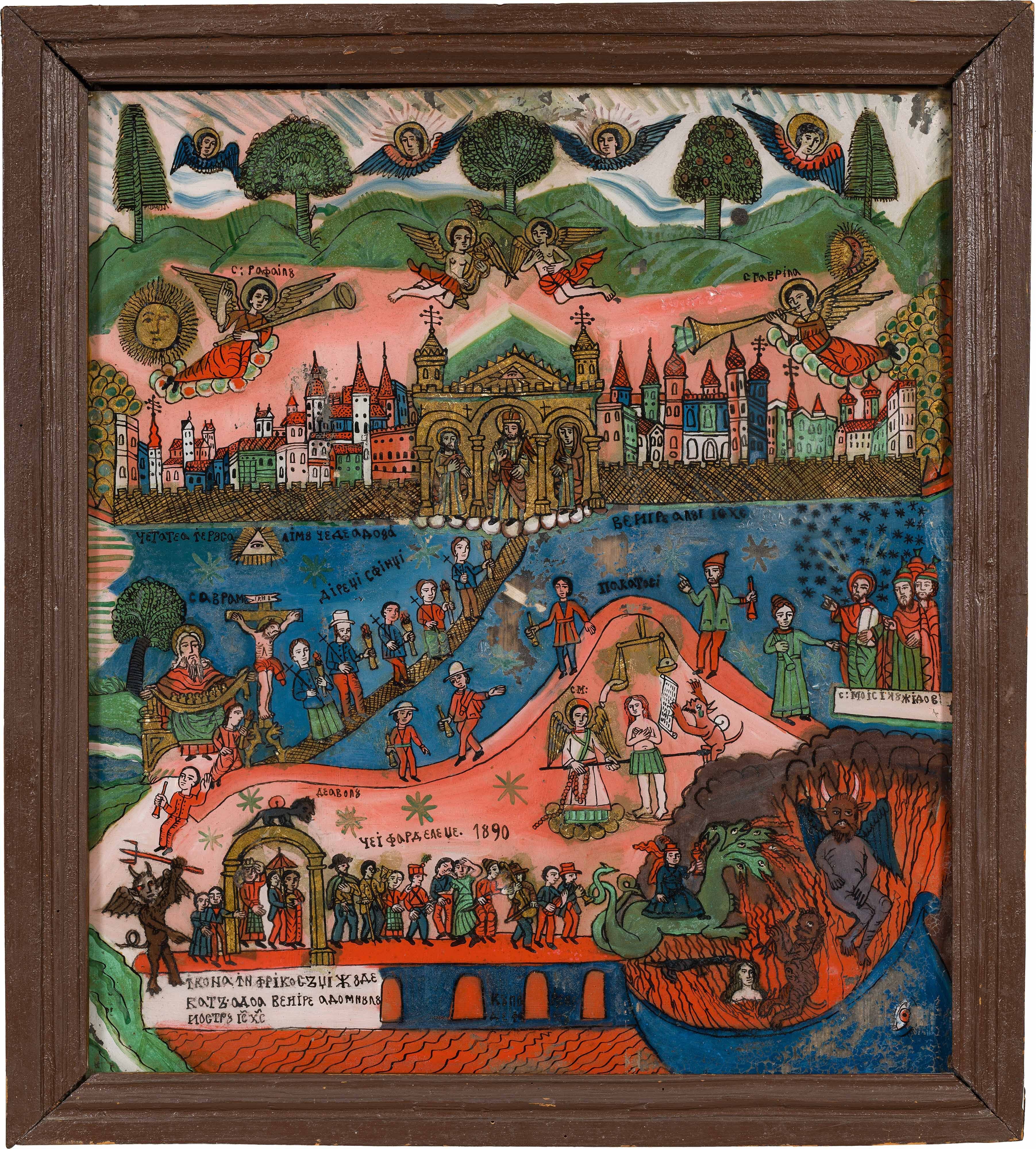painting behind glass,; romanian-cyrillic inscribed and dated "1890"; wooden frame; painting partially rubbed