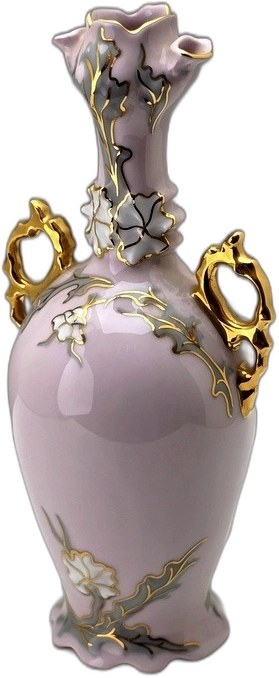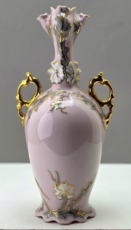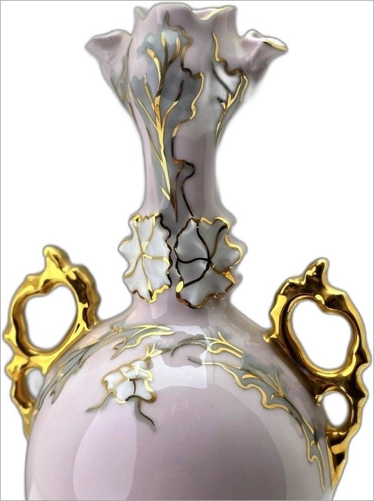 Wazon ręcznie malowany , dekorowany 14-karatowym złotem , oraz dodatkowo wstawkami z białej porcelany .