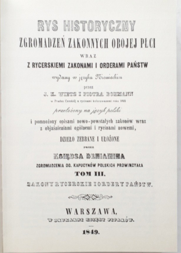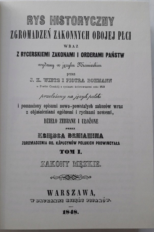 Wydany w języku niemieckim przez J. K. WIETZ i Piotra Bohmann w Pradze Czeskiej z rycinami kolorowanemi roku 1821, przełożony na język polski i pomnożony opisami nowopowstałych zakonów wraz z objaśnieniami ogólnemi i rycinami nowemi, dzieło zebrane i ułożone przez księdza Beniamina Zgromadzenia OO. Kapucynów Polskich Prowincjała.