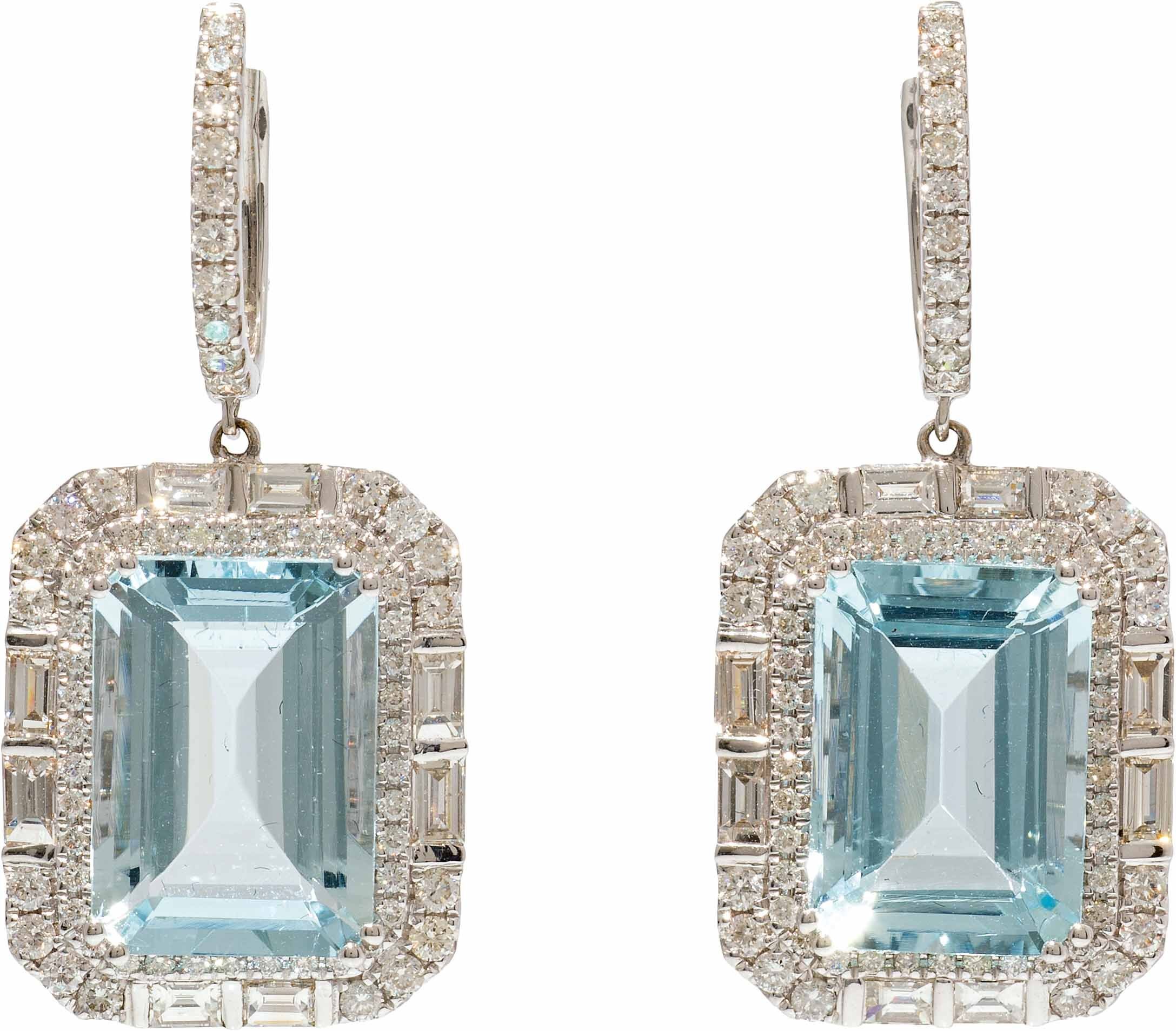 18k white gold, 2 emerald cut aquamarines with totall. approx. 10.00 ct, baguette and brilliant cut diamonds with totall. approx. 2.50 ct