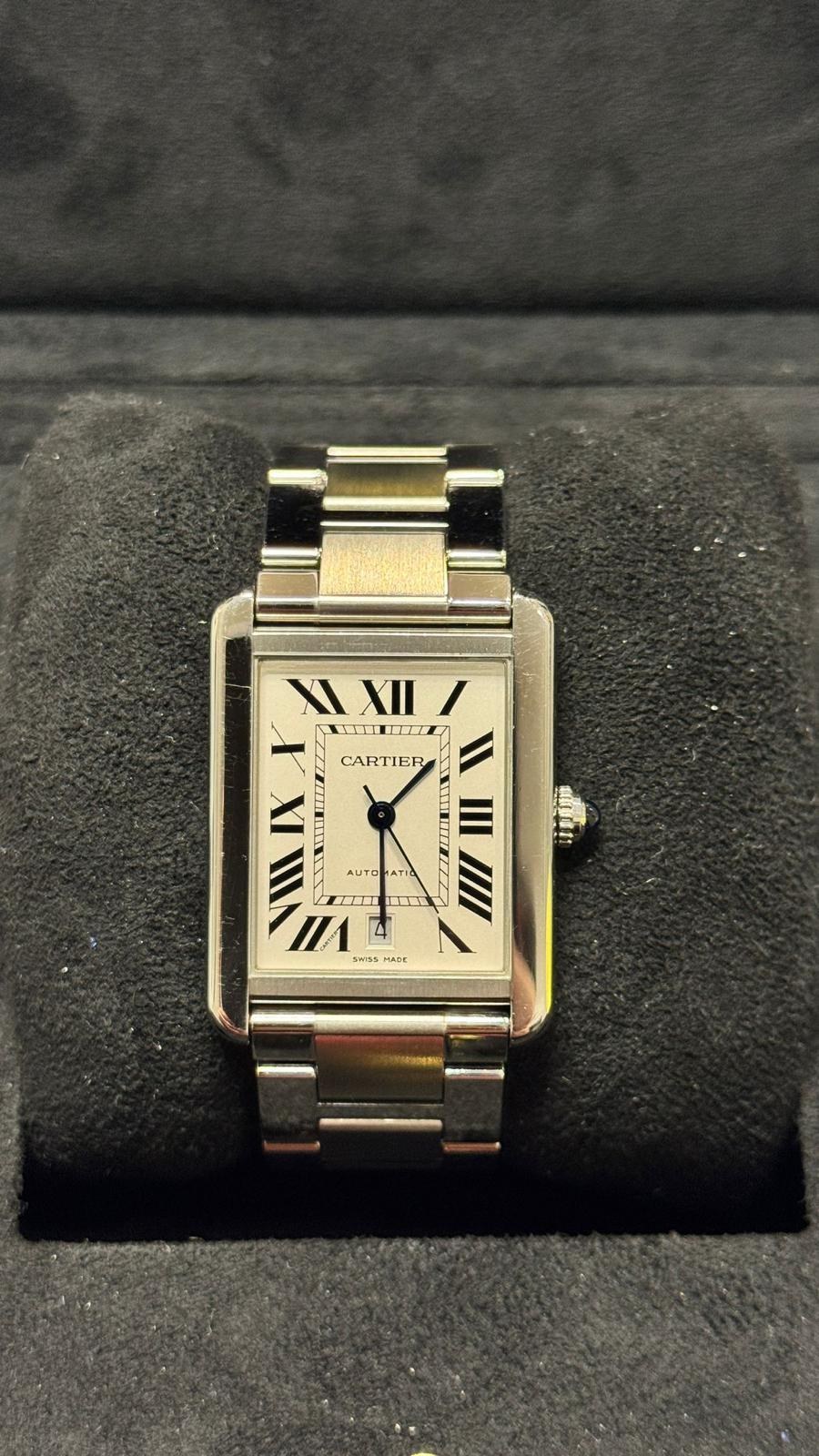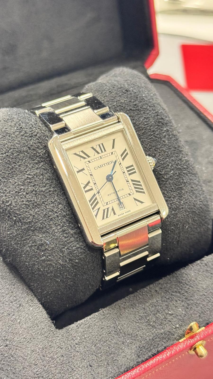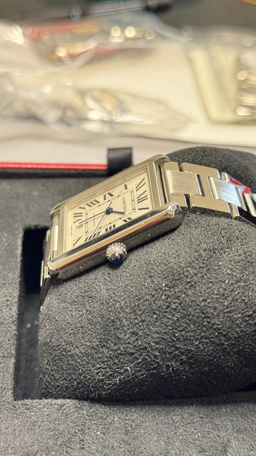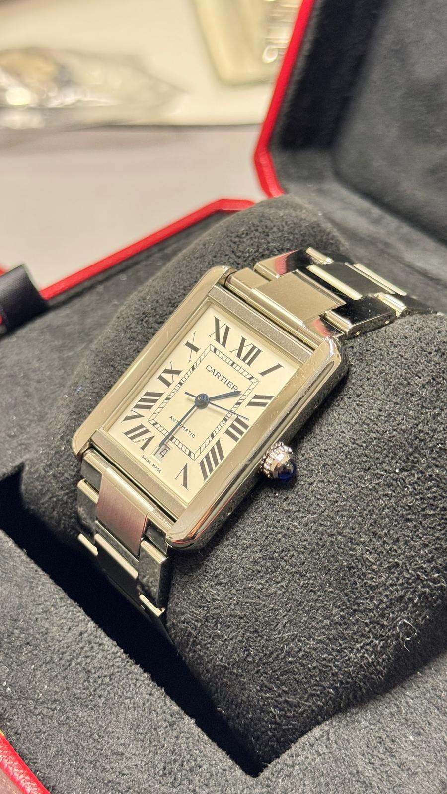 BRAND CARTIER MODEL (WATCH) TANK SOLO WINDING AUTOMATIC CASE MATERIAL STEEL STRAP MATERIAL STEEL CONDITION USED (EXCELLENT) THE ITEM SHOWS SLIGHT SIGNS OF WEAR, SUCH AS LIGHT SCRATCHES, BUT NOT PERCEPTIBLE TO THE TOUCH. KIT WITHOUT ORIGINAL BOX OR ORIGINAL DOCUMENTS ONE-YEAR SHOP WARRANTY CALIBER AUTOMATIC WINDING CASE CASE MATERIAL STEEL DIAMETER 31 X 40.8 MM WATERPROOF 3 ATM BEZEL MATERIAL STEEL GLASS SAPPHIRE GLASS DIAL SILVER NUMBERS ON THE DIAL ROMAN STRAP STRAP MATERIAL STEEL STRAP COLOR STEEL FOLDING CLASP CLASP MATERIAL STEEL FUNCTIONS