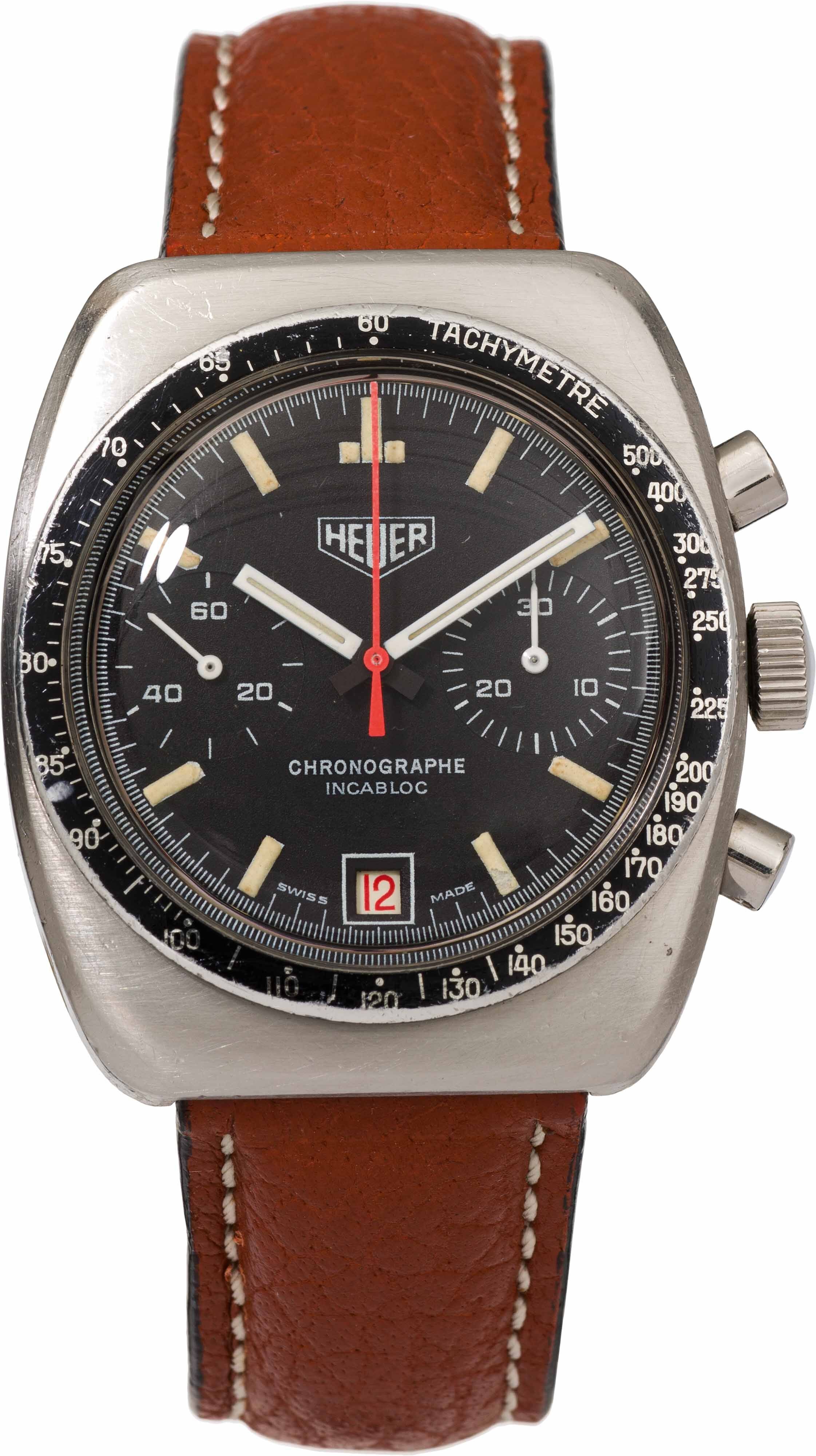 stainless steel, leather; sapphire glass, black dial with date, small second and chronograph; stainless steel case, bezel with tachymeter scale; 2 pushers, crown, screwed bottom; hand winding, calibre "Vajoux 7734"; brown leather watchband with stainless steel pin buckle
